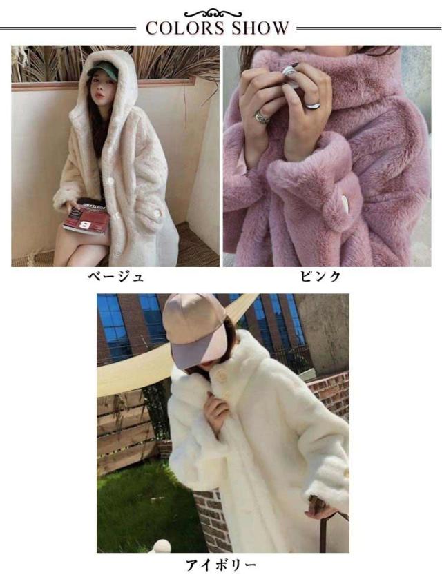 ボリュームファーコート フェイクファー もふもふ 暖かい ボリューム ファー コート フード付き ロング丈 もこもこ ロングコート モコモココート ボアパーカー ボアコート 毛皮コート かわいい アウター ベージュ ピンク アイボリー