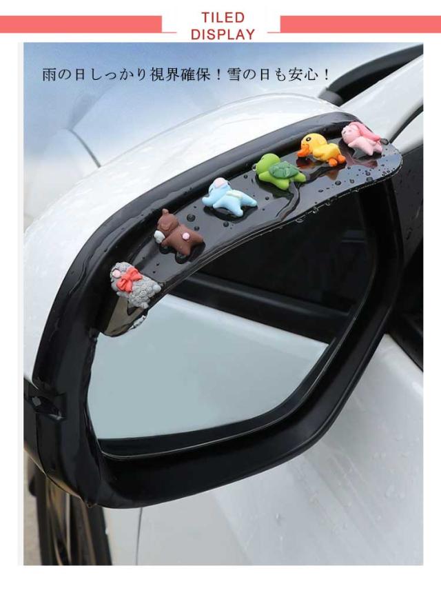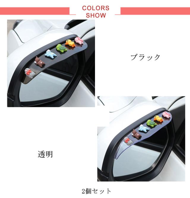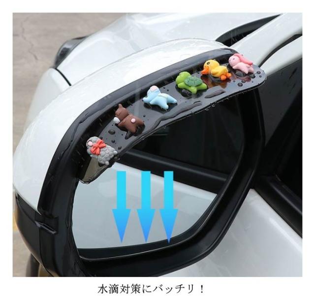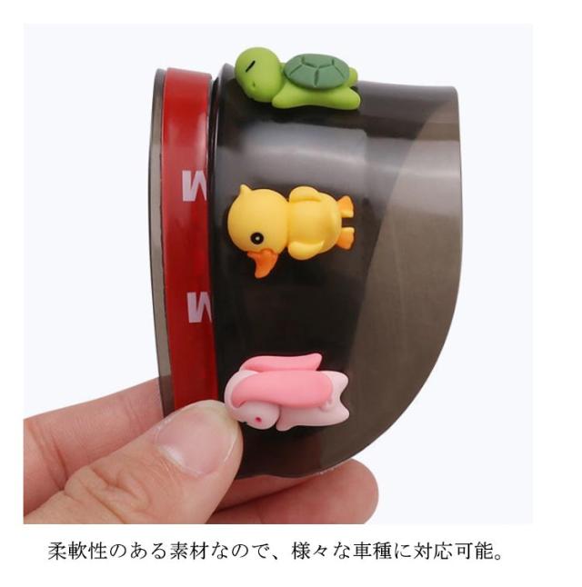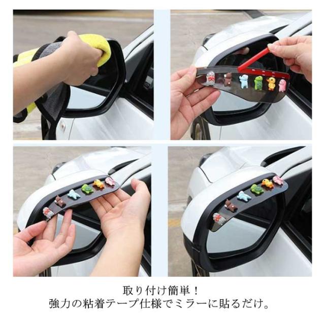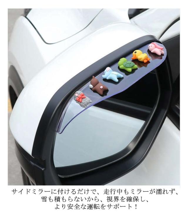 | 雨の日しっかり視界確保!雪の日も安心!ドアミラーバイザー。 取り付け簡単!強力の粘着テープ仕様でミラーに貼るだけ。 動物たちが寝ているデザインが可愛らしく、見ているだけで心が癒される。 水滴対策にバッチリ!サイドミラーに付けるだけで、走行中もミラーが濡れず、雪も積もらないから、視界を確保し、より安全な運転をサポート! 柔軟性のある素材なので、様々な車種に対応可能。 | |