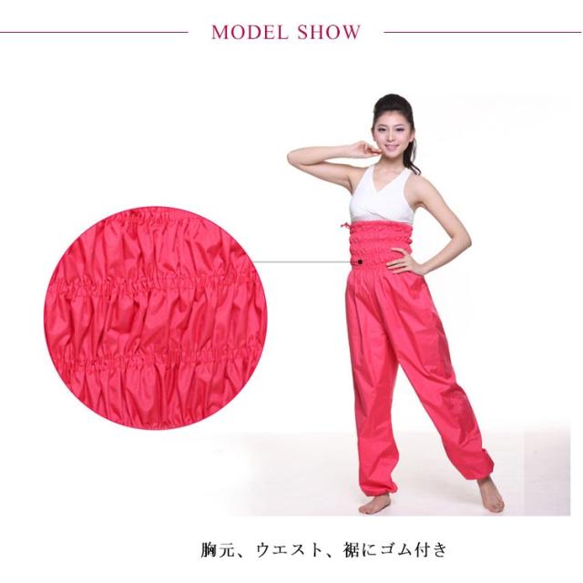| ハイウエストパンツ/つなぎ(オールインワン)サウナパンツ。 薄めのやわらかい生地で動きやすく、たっぷり汗がかけます。 足元から胸元までたっぷり汗をかける保温性バッチリのつなぎタイプのサウナパンツ。 スポーティーでオシャレなウォームアップウエア♪ 胸元、ウエスト、裾にゴム付き | |