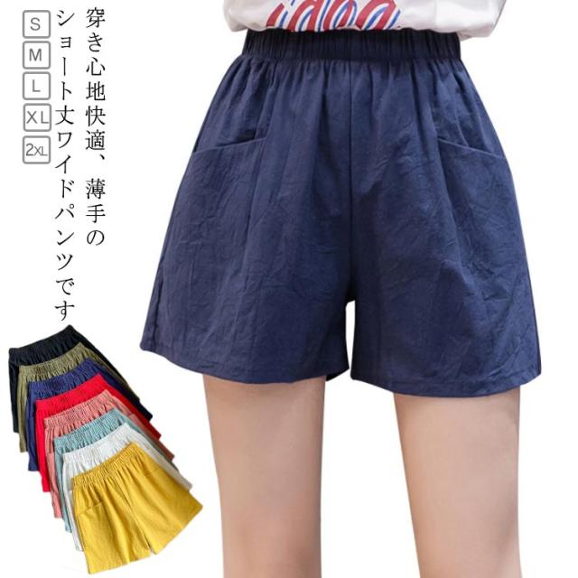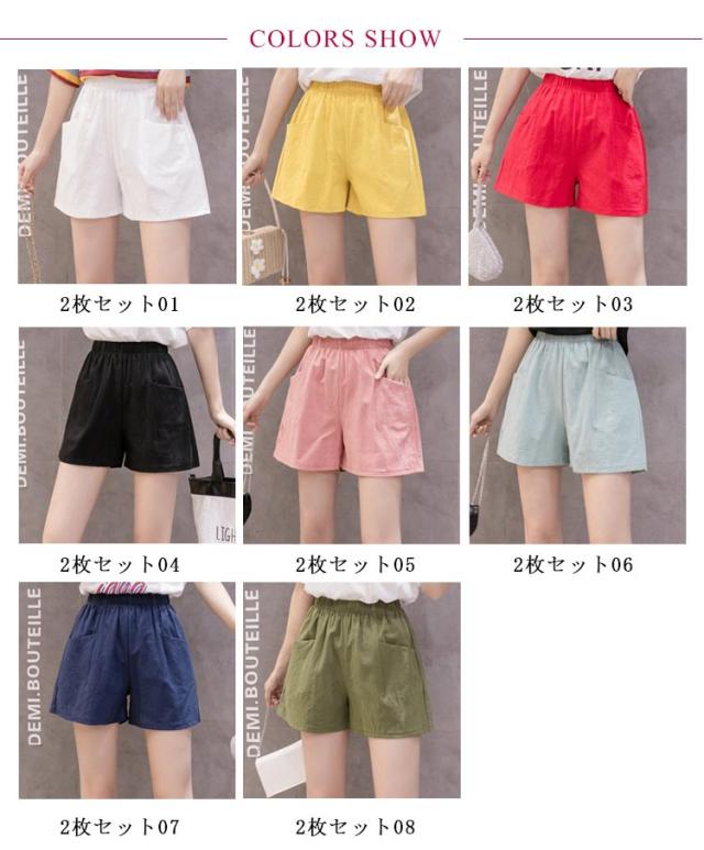 2枚セット リネンパンツ レディース 綿麻パンツ リネン パンツ 綿麻 綿 麻 ワイド パンツ ワイドパンツ 短パン ひんやり 薄手 無地 ウエストゴム ポケット付き 母の日 プレゼント ギフト 母の日プレゼント 母の日ギフト