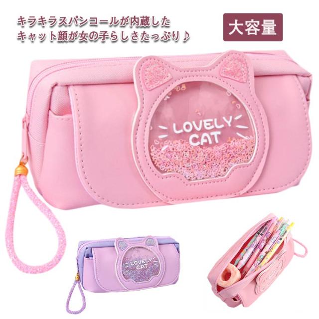 ペンケース 大容量 かわいい 筆箱 筆入れ ペン入れ キラキラ ネコ 小学生 女の子 入学祝い 誕生日 ギフト 中学生 化粧ポーチ 送料無料 小物 ポーチ 三つ収納ポケット