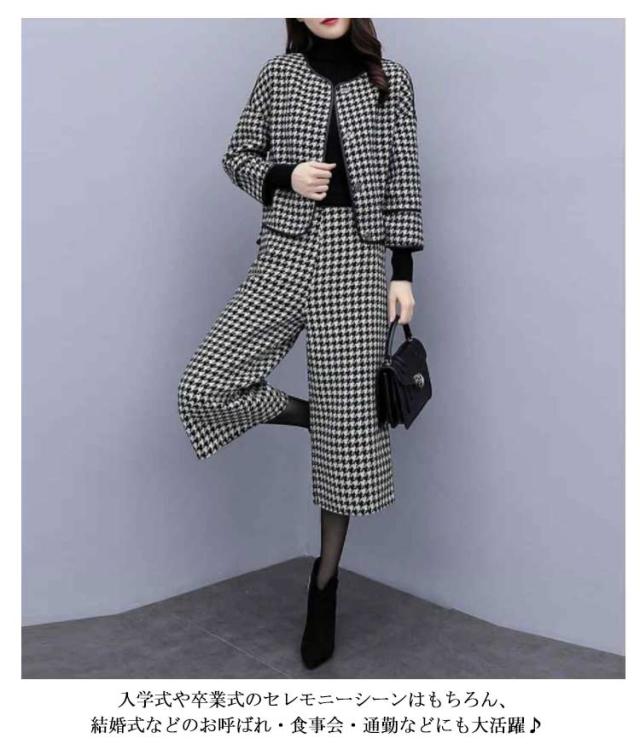 スーツ レディース 入学式 卒業式 スーツ 母 入園式 卒園式 服装 セレモニースーツ フォーマル ビジネススーツ パンツスーツ チェック柄 長袖 ノーカラージャケット 七分丈 ワイドパンツ セットアップ 母親 結婚式 オフィス 七五三 通勤 女性 OL 春 秋 冬 送料無料