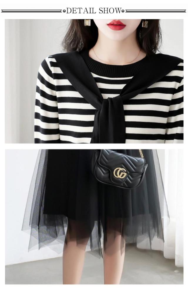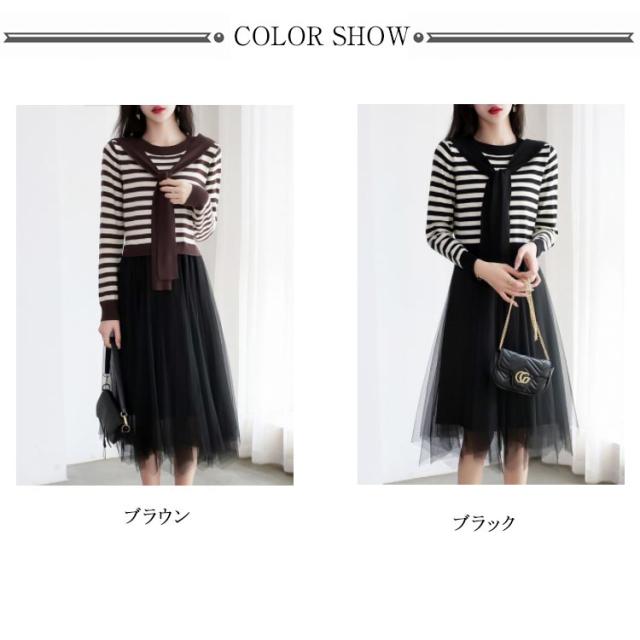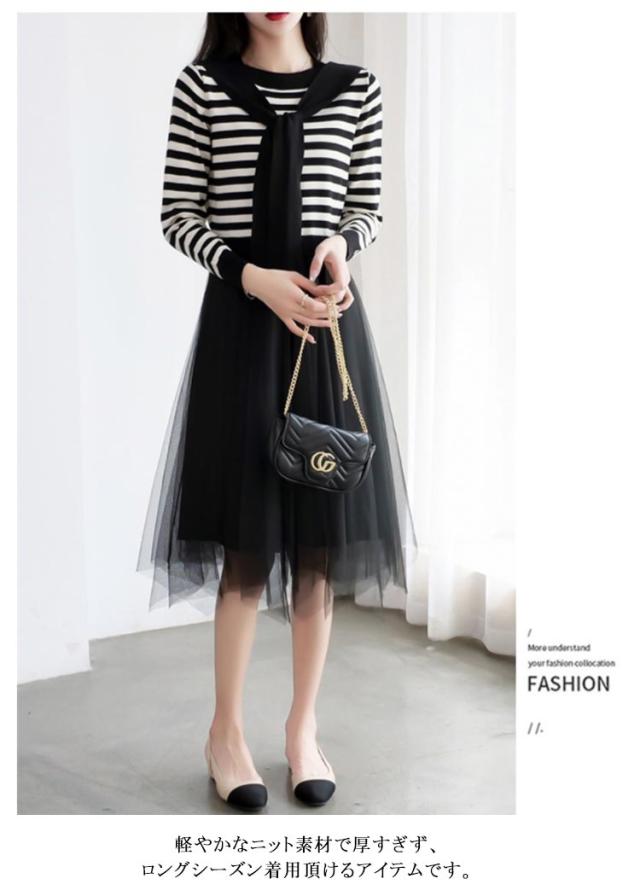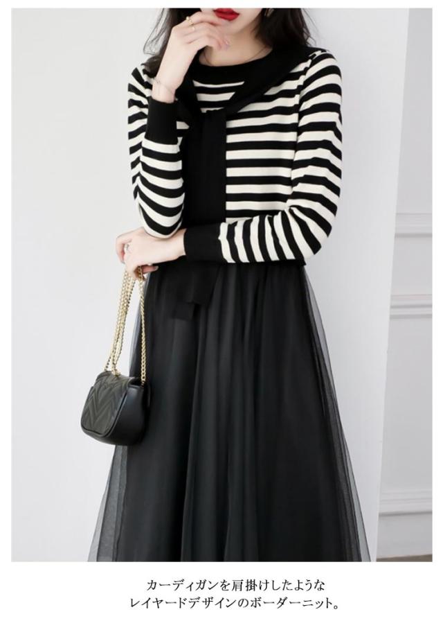 ニットチュールワンピース レディース ボーダー柄 ボーダーニット 肩掛け フェイクレイヤード チュール ドッキング 長袖 切り替え 異素材 カジュアル おしゃれ きれいめ 春 秋 全2色