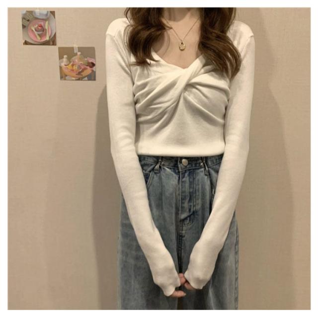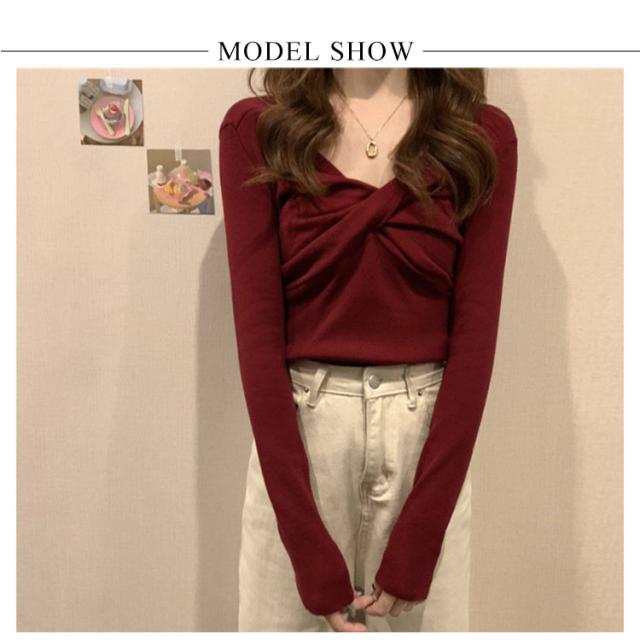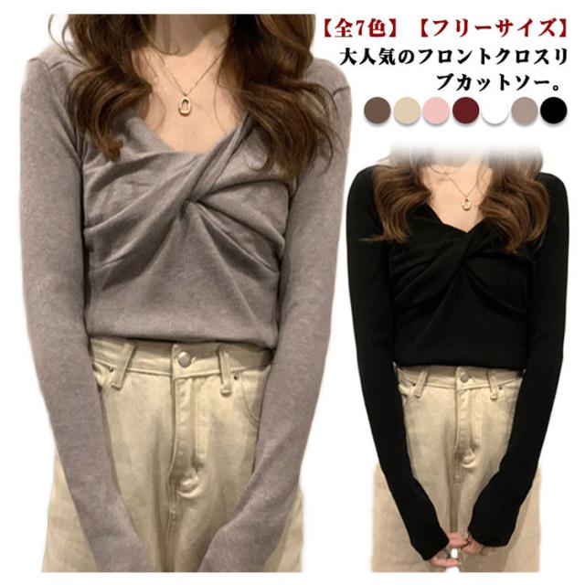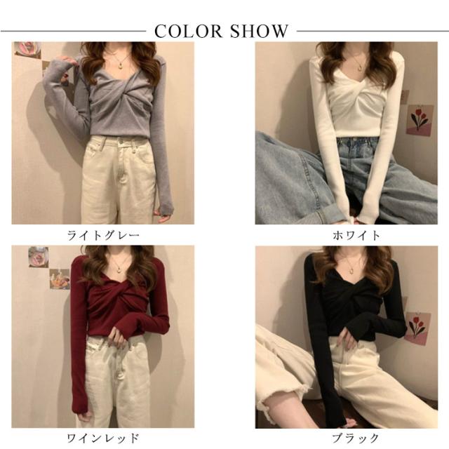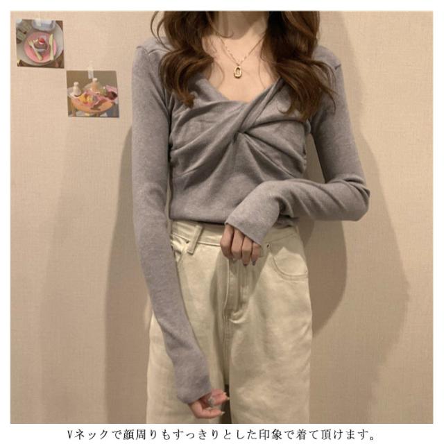 長袖tシャツ レディース 長袖 tシャツ リブ カットソー フロントクロス Vネック 大人可愛い フェミニン リブニット トップス クロス リボン ブラウス 春 秋 服 通勤 オフィス デイリー 普段着 おしゃれ【送料無料】