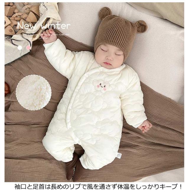 | さりげない雲ステッチが可愛い♪軽くて暖かいベビー服。 ポリエステル、中綿、裏ボアの3層構造、風の侵入をしっかりブロックし、暖かい空気を逃がさず、まるで着る布団! 袖口と足首は長めのリブで風を通さず体温をしっかりキープ! の裏ボア、マシュマロのような肌触り、快適な着心地。 斜め掛けになったスナップボタン、オムツ替えなど時、お腹を冷えることなく、安心。 スッキリしたノーカラーデザイン、よこになってもごわつかず、とても快適。 | |