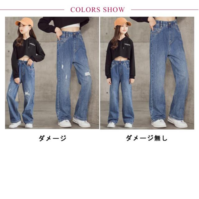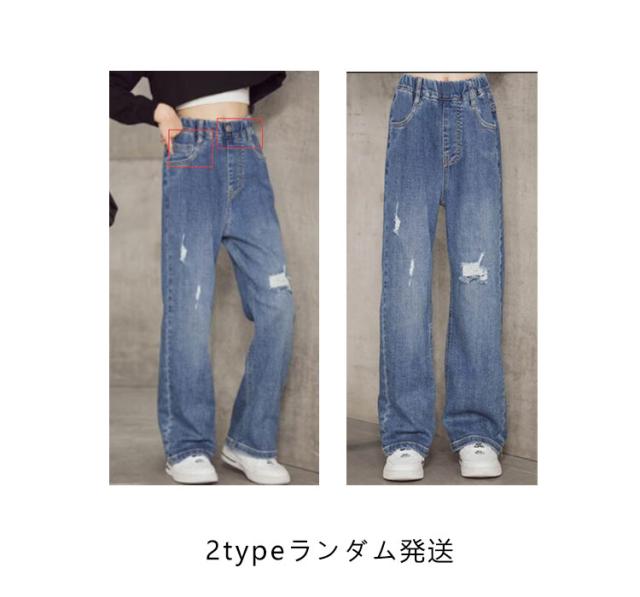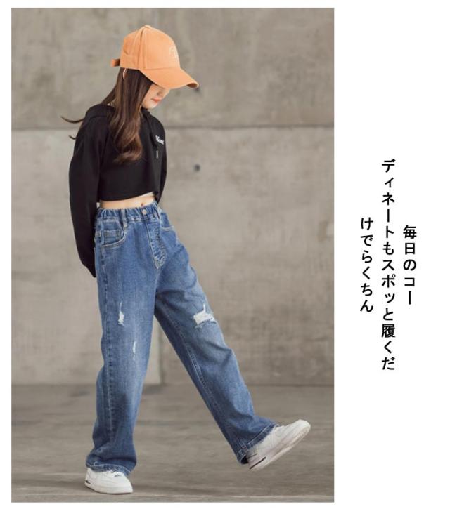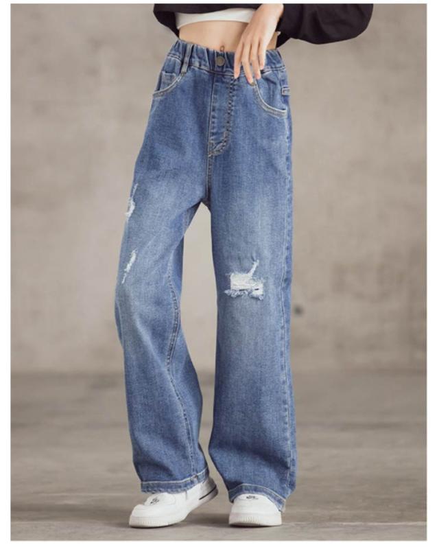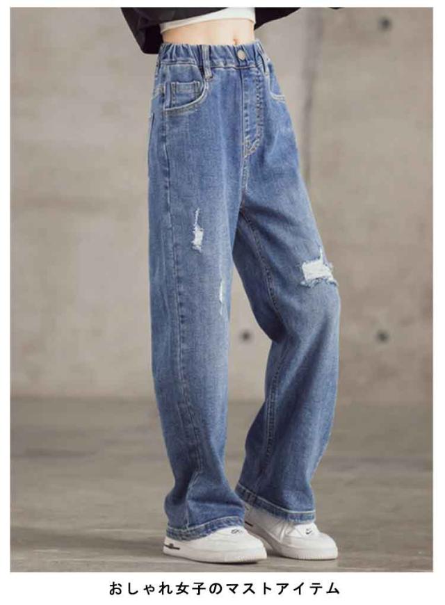 デニムパンツ キッズ 韓国子供服 おしゃれ ワイドパンツ 女の子 子供服 ウエストゴム ダメージ 長ズボン デニムロングパンツ ガールズ デニムダンス ダメージデニムパンツ ジュニア 小学生 中学生 子供 服 110cm 120cm 130cm 140cm 150cm 160cm