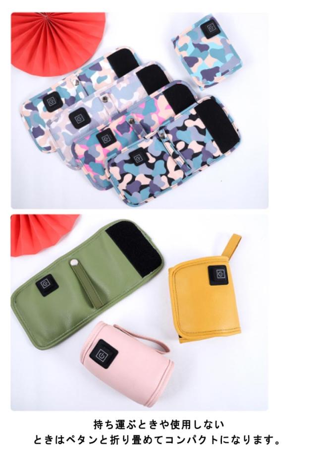| 外出先でミルクの温め可能なボトルウォーマーです。 マジックテープ式で様々な大きさのボトルに対応!ミルク以外のドリンクの保温にもご使用いただけます。 高温60℃→中温50℃→低温40℃と好みに合わせてボタン1つで温度調節が可能です。 持ち運ぶときや使用しないときはペタンと折り畳めてコンパクトになります。 やUSB ACアダプタ、車のシガーチャージャーなどのUSBポートから電源が取れ、お家のリビング、ベッドサイドのほか、お出かけ、旅行先でもミルクの温め・保温が可能に。 | |