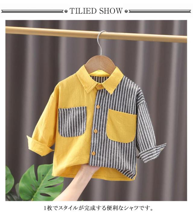 キッズ カジュアルシャツ ストライプ切り替え 男の子 男児 子供 長袖 前開き ボタン ポケット付き 通園 通学 おしゃれ 可愛い 春 秋 全2色