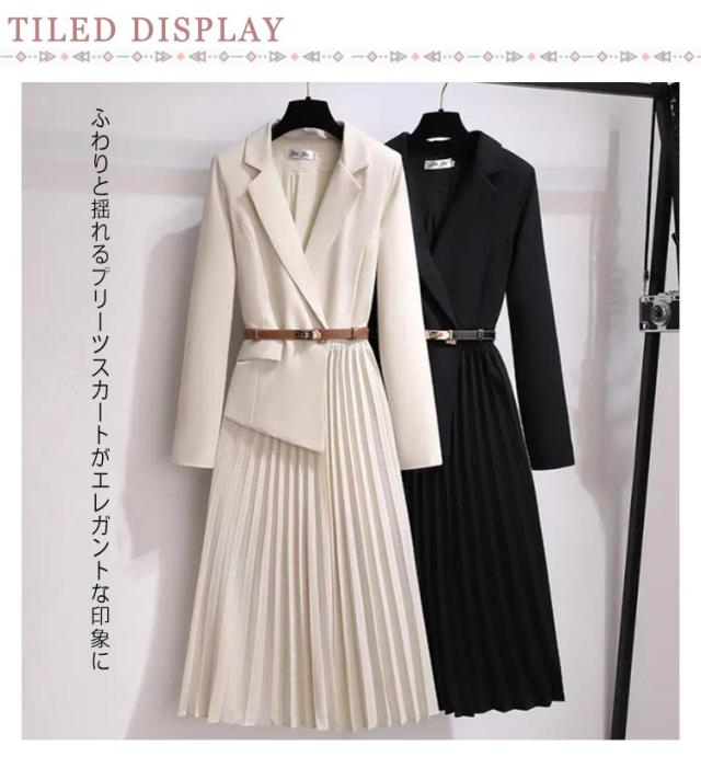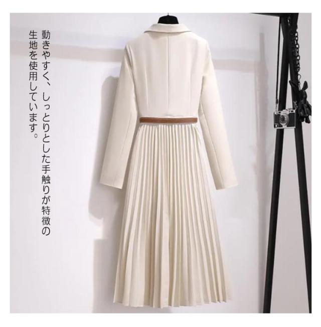 | ジャケットとプリーツスカートをドッキングさせた新鮮なデザインのワンピース。 ふわりと揺れるプリーツスカートがエレガントな印象に 長めの着丈なのでフォーマルなシーンにもぴったりのアイテムです。 1枚で上品な着こなしが完成し、セレモニーから通勤まで幅広いシーンにお勧めです。 合皮ベルトでウェストマークが可能です。 動きやすく、しっとりとした手触りが特徴の生地を使用しています。 | |