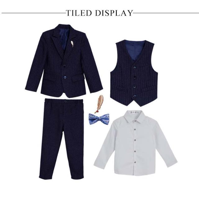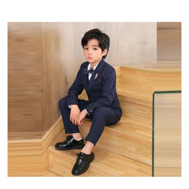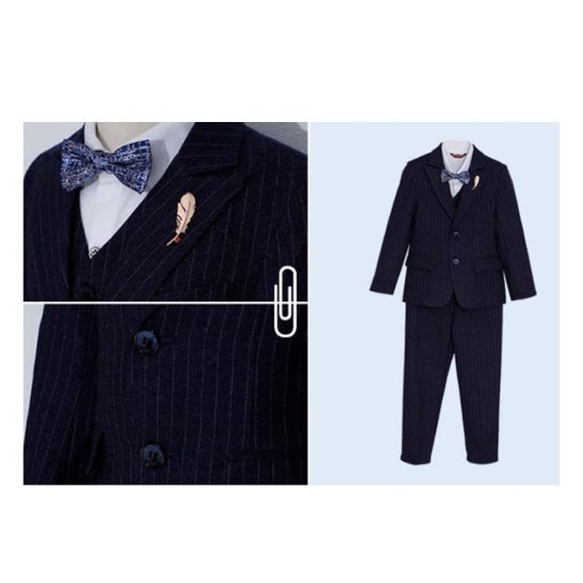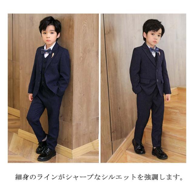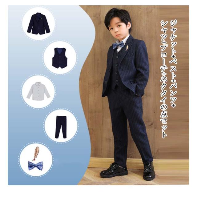 | 入園・入学だけでなく結婚式やお食事会、発表会など華やかなシーンを彩るストライプスーツセット。【6点セット】 ジャケット+ベスト+パンツ+シャツ+プローチ+ネクタイの6点セット これだけあればフォーマルシーンはバッチリ揃います。 落ち着いた雰囲気で使いやすい深いネイビー。 細身のラインがシャープなシルエットを強調します。袖口には3つの飾りボタンがついたおしゃれ仕様。背当て部分に裏地付きで上品さをオンしています。 ハーフパンツよりも大人っぽく着られるロングパンツには蝶ネクタイを合わせて、可愛らしさも兼ね備えたスタイルです。 ネクタイやプローチまでついているので、すぐにワンランク上のフォーマルスタイルが完成します。 卒業式や、結婚式、発表会など、セレモニーから冠婚葬祭まで幅広いシーンで活躍します。 | |