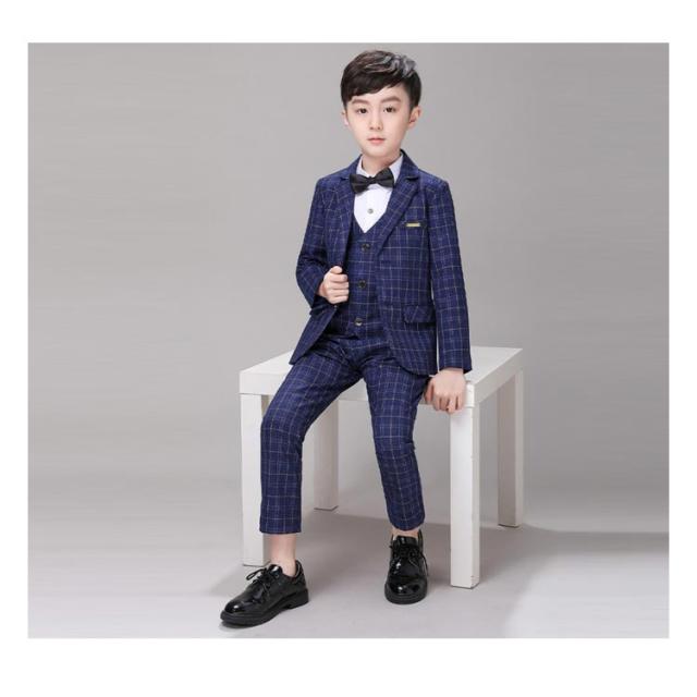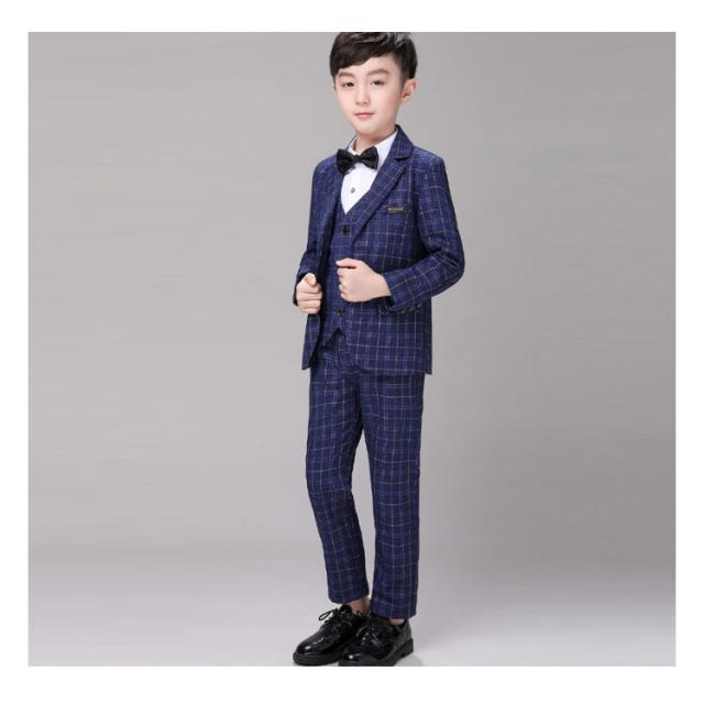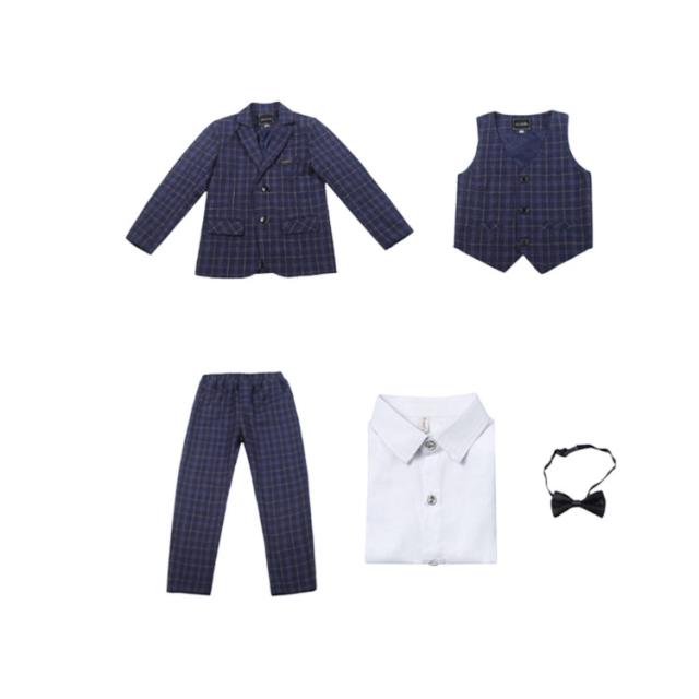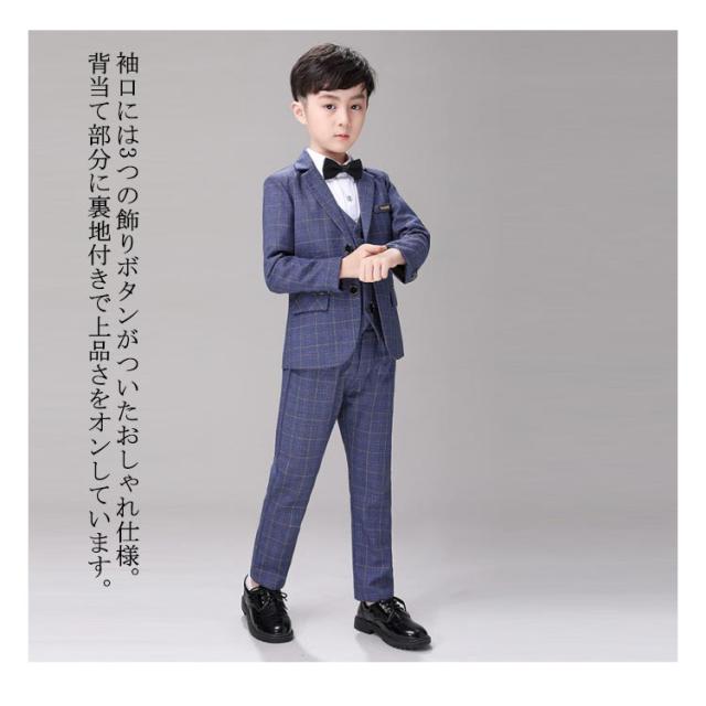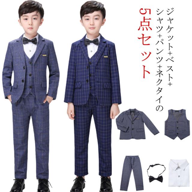 キッズ スーツ 男の子 フォーマル 結婚式 発表会 子供 スーツセット チェック柄 5点セット 大きいサイズ ネイビー 紺 ネクタイ付き ロングパンツ 子供スーツ フォーマルスーツ セレモニー 入学式 卒業式 スーツ おしゃれ