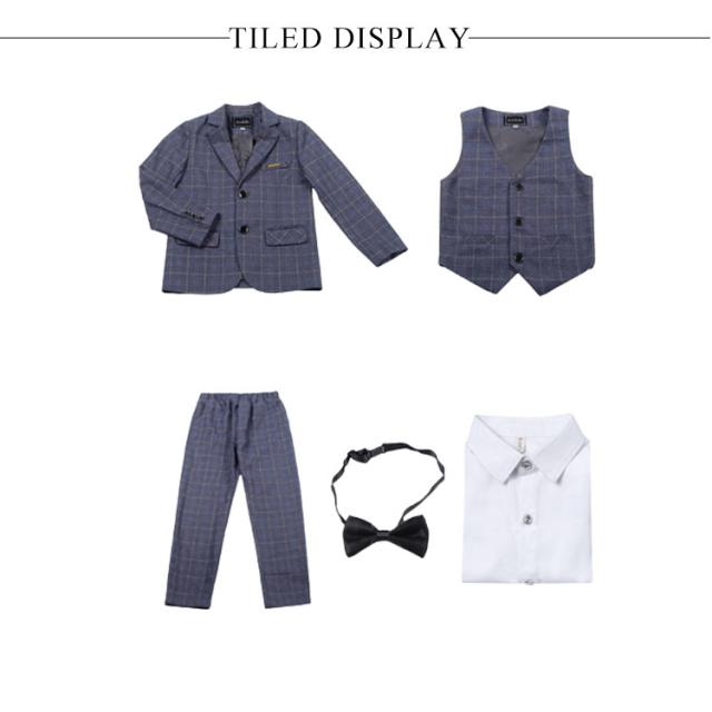 | スタイリッシュな『チェック柄のフォーマルスーツ』【ジャケット+ベスト+シャツ+パンツ+ネクタイの5点セット】 これだけあればフォーマルシーンはバッチリ揃います。 全体的にかっちりとしすぎないように、リラックス感のある柔らかな雰囲気に仕立てています。 袖口には3つの飾りボタンがついたおしゃれ仕様。背当て部分に裏地付きで上品さをオンしています。 ハーフパンツよりも大人っぽく着られるロングパンツには蝶ネクタイを合わせて、可愛らしさも兼ね備えたスタイルです。 ネクタイやプローチまでついているので、すぐにワンランク上のフォーマルスタイルが完成します。 卒業式や、結婚式、発表会など、セレモニーから冠婚葬祭まで幅広いシーンで活躍します。 | |