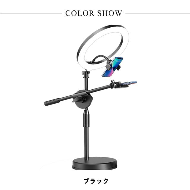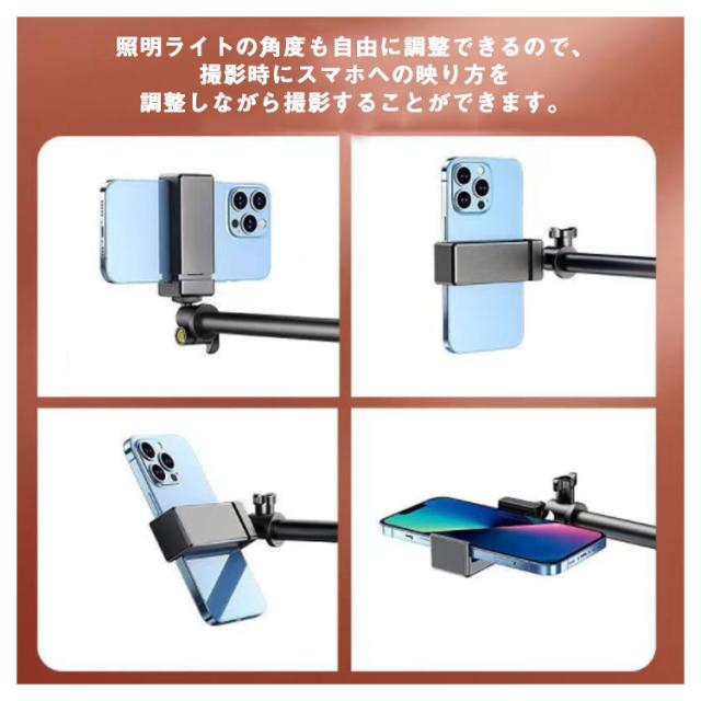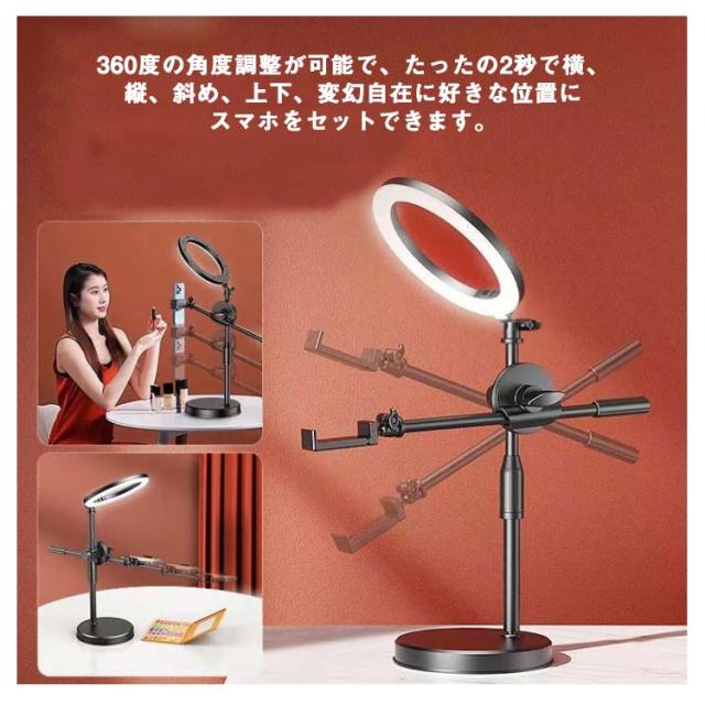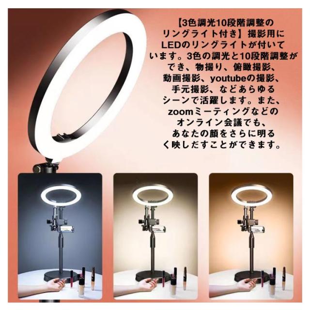 | 手元を映すの俯瞰撮影スマホスタンド【26cmリングライト付き】 リングライトのサイズが26cmにサイズアップしました。この俯瞰スマホスタンドは卓上で使いやすい卓上タイプです。手元撮影をしたい方や、アクセサリーやネイルの仕上がりの撮影などを上から撮影する方などにピッタリのスマホスタンドです。 【どんな角度にも調整可能】360度の角度調整が可能で、たったの2秒で横、縦、斜め、上下、変幻自在に好きな位置にスマホをセットできます。照明ライトの角度も自由に調整できるので、撮影時にスマホへの映り方を調整しながら撮影することができます。 【3色調光10段階調整のリングライト付き】撮影用にLEDのリングライトが付いています。3色の調光と10段階調整ができ、物撮り、俯瞰撮影、動画撮影、youtubeの撮影、手元撮影、などあらゆるシーンで活躍します。また、zoomミーティングなどのオンライン会議でも、あなたの顔をさらに明るく映しだすことができます。SNS、TikTok、インスタグラムなど、このスマホスタンドで撮影した写真や動画をどんどんアップして魅力的な写真を投稿しちゃいましょう♪ 【電源は便利なUSB仕様】電源はUSBコンセント、デスクトップ、ノートPC、モバイルバッテリーなどから給電できる便利なUSB仕様となっております。場所を選ばず撮影ができます。使用の際は電源コードを強く引っ張らないようご注意ください。 | |