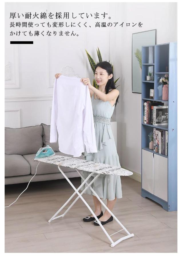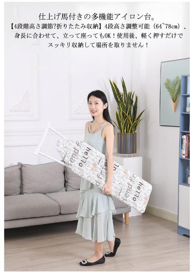 | 先端の丸みが使いやすいな舟型。どんな衣類もアイロンがけしやすいです。 アイロンを置く場所もあるので、とても便利です。 アルミコーティング加工。表面のアルミコーティング加工が高い熱効率を発揮。素早いアイロン仕上げが可能 厚い耐火綿を採用しています。長時間使っても変形しにくく、高温のアイロンをかけても薄くなりません。 脚は折りたためるので,シンプルな形で収納場所にも困りません。 仕上げ馬付きの多機能アイロン台。【4段階高さ調節?折りたたみ収納】 4段高さ調整可能(64~78cm)、身長に合わせて、立って座ってもOK!使用後、軽く押すだけでスッキリ収納して場所を取りません! 太い鋼パイプを加えたX型構造は、優れた支持力を提供し、耐久性があり、揺れがなく、倒れにくい。 シリコン滑り止めの足は、滑り止めの効果が良くて、安定性が強くて、更に有効に地面を保護して傷をつけません。 仕上げ馬に袖や肩口を通すことで、衣類をきれいに仕上げられます。(仕上げ馬とは、ワイシャツやジャケットの細かい部分を仕上げるのに適した小さなアイロン台のこと。) | |