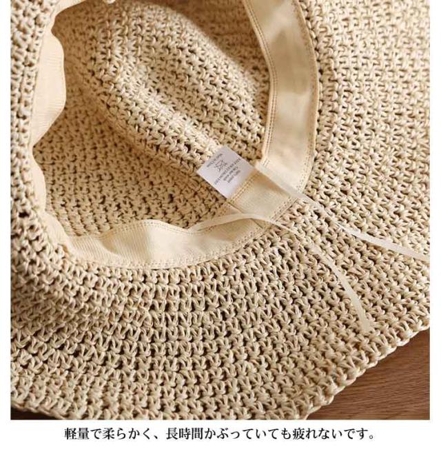 | 季節感や清涼感といった印象が手軽に演出でき、顔全体が隠れる大きなつばによる、UV対策をしながら春夏のファッションが楽しめるのも嬉しいポイントです。 ツバがしっかりと日差しをカットしてくれるので紫外線対策もバッチリ! リポンがアクセント!ナチュラルな色合いは、幅広いコーデと馴染みます。 軽量で柔らかく、長時間かぶっていても疲れないです。 内側にはサイズ調整ができるように、紐がついているので、お好みのサイズ感でかぶることができます! くるくるっと巻いて折りたたむと、バッグの中に入る程コンパクトになります!旅行などにもとっても便利。 | |