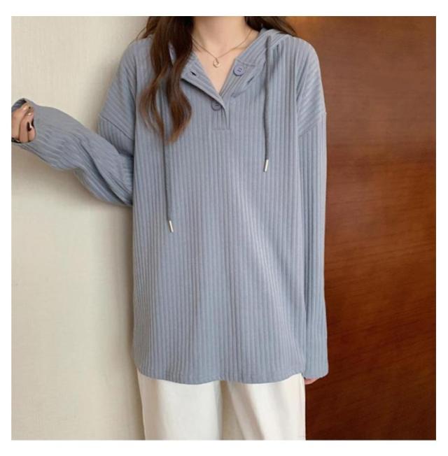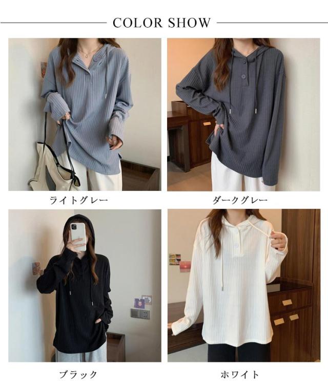 | 春秋に着回し力抜群な薄手の長袖フーディートップス。 胸元ボタンの開け閉めで表情が変わり、合わせるアイテム次第で印象チェンジも思いのまま。 首元をスッキリと魅せてく れるので、小顔効果も期待できます機能性もバツグン! 肌触りも良く、着心地抜群だから毎日着たくなる♪ | |