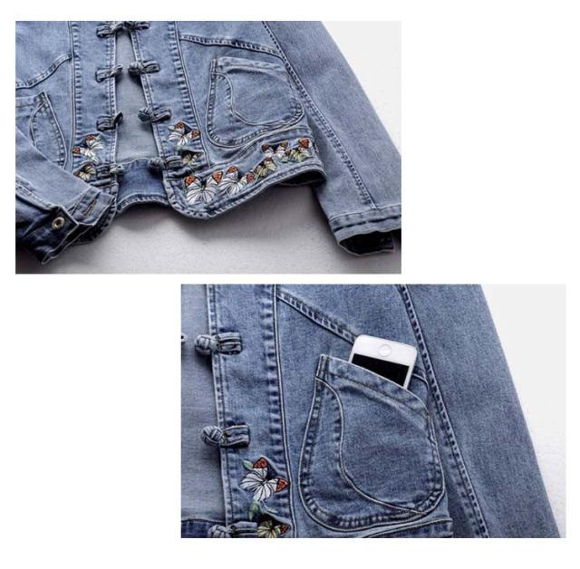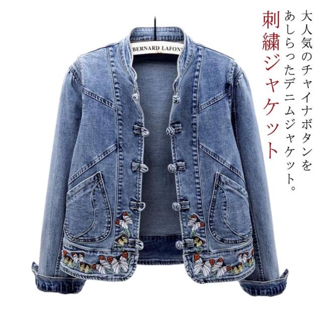 送料無料 デニムジャケット 刺繍 春新作 レディースアウター エスニック系 チャイナボタン 長袖 Gジャン 立ち襟 ジャケット ブルゾン 刺繍ジャケット 春 秋 30代 40代 50代