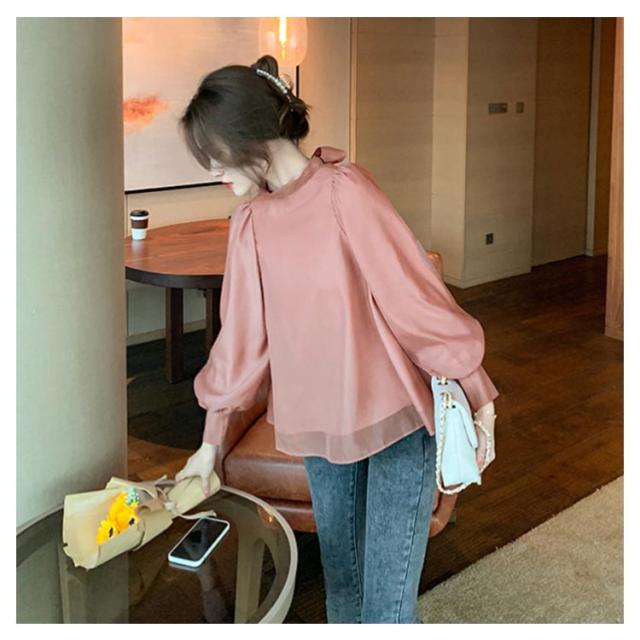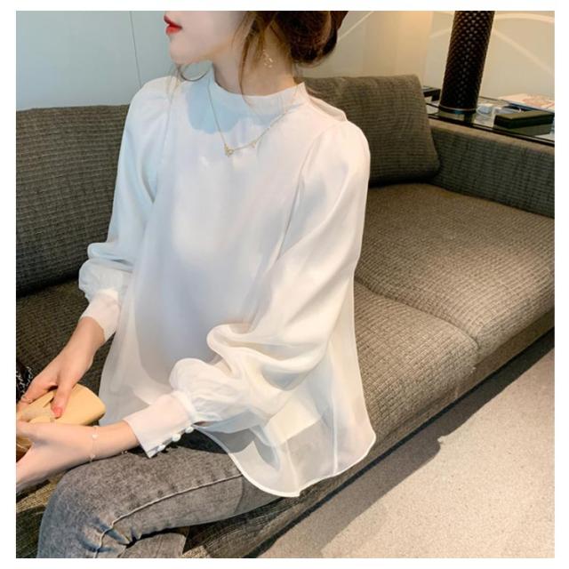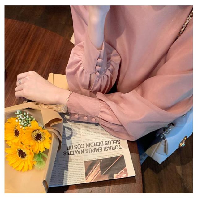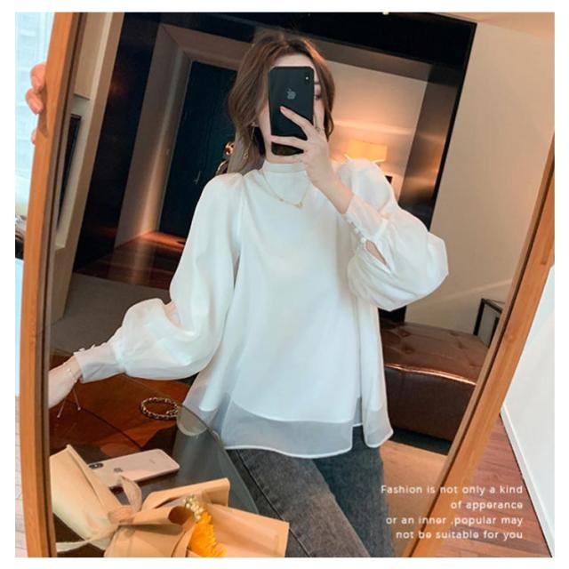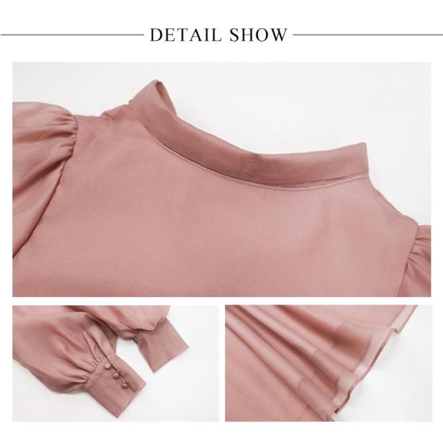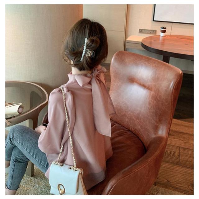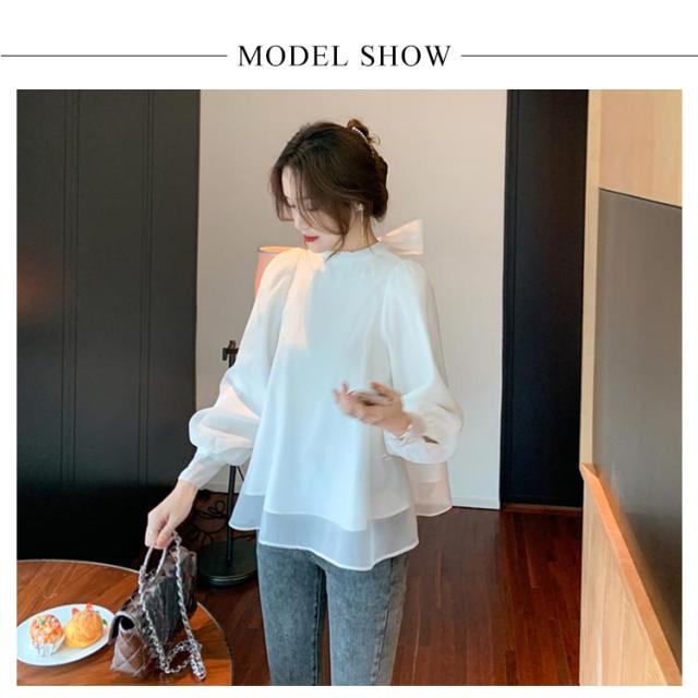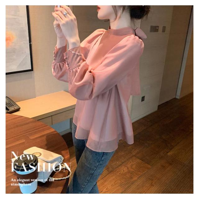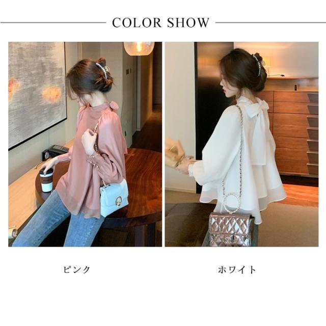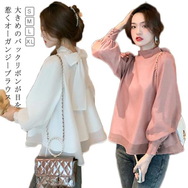 ブラウス バックリボン レディース 長袖 パフスリーブ スタンドカラー ハイネック トップス ボウタイブラウス Aライン フレア ボリューム袖 大人可愛い おしゃれ 体型カバー ゆったり 春 秋 無地 S M L XL 白 ホワイト ピンク【送料無料】