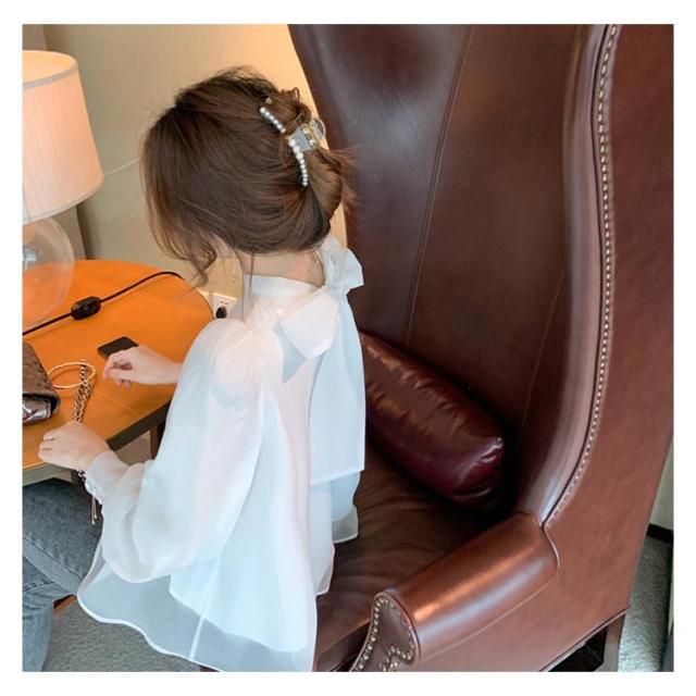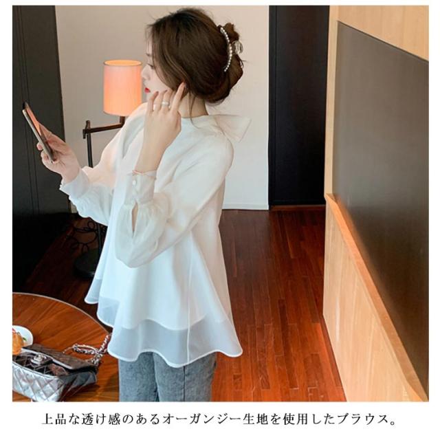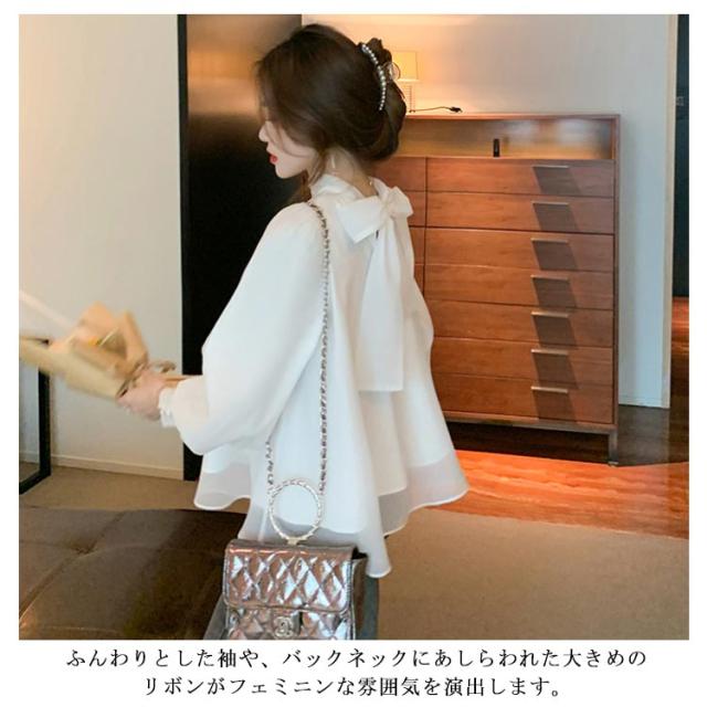 | 大きめのバックリボンが目を惹くオーガンジーブラウス 上品な透け感のあるオーガンジー生地を使用したブラウス。 ふんわりとした袖や、バックネックにあしらわれた大きめのリボンがフェミニンな雰囲気を演出します。 裾にかけてボリュームが出るaラインシルエットが華やか。 レディなスカートにはもちろん、デニムと合わせてカジュアルダウンしたスタイリングもおすすめです。 | |