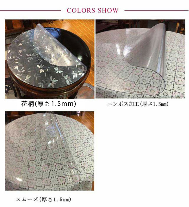 | 色 | スムーズ(厚さ1.5mm) エンボス加工(厚さ1.5mm) 花柄(厚さ1.5mm) |