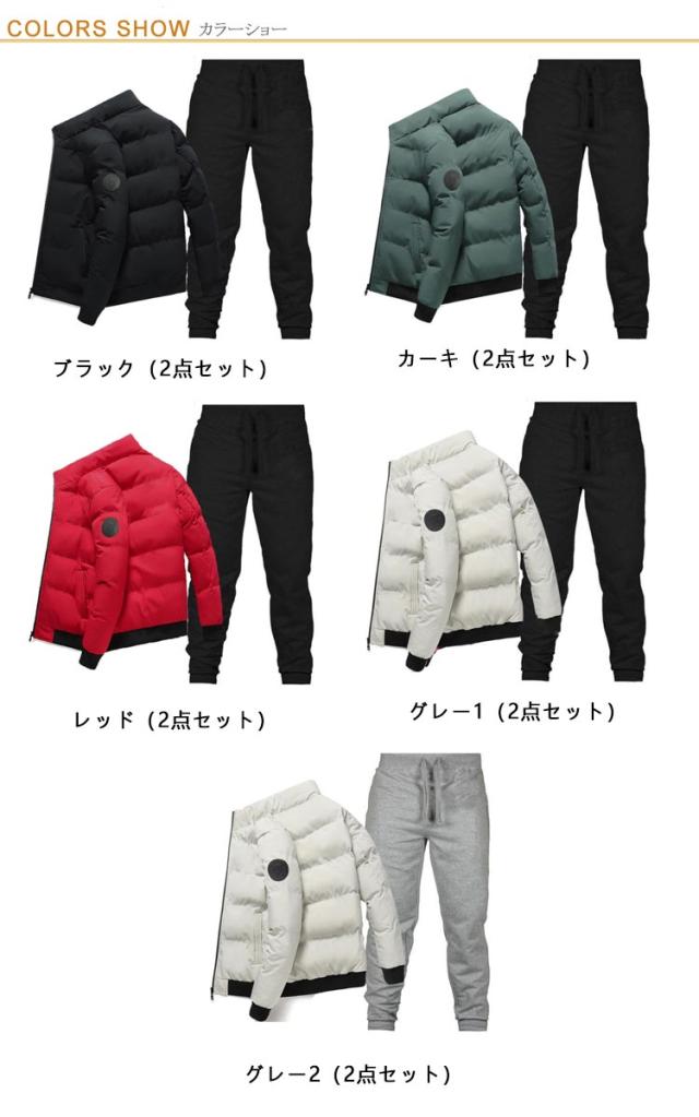 | S-4XL!防寒ジャージ上下セット。 ポリエステル素材を使用し、厚手であったかい、軽い着心地、機能的で保温性に優れた中綿ジャケット+スウェットパンツ。 防寒着ならこれ!軽い中綿素材を入り、防寒対策バッチリ。 足首をリブで絞ったジョガータイプ、伸縮性があり程よいフィット感のある仕上がりです。 お部屋着としてはもちろん、外出時やレジャーなどウォーキングや自転車など、スポーティーなシーンにもおすすめ。 | |