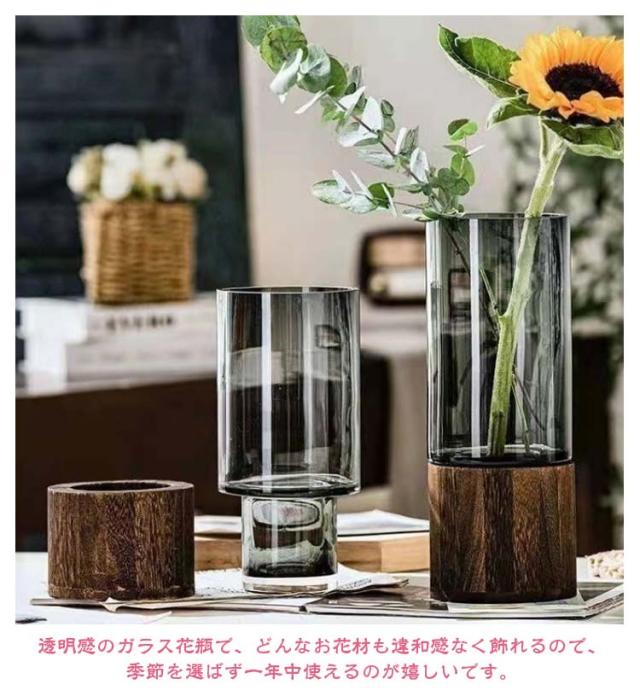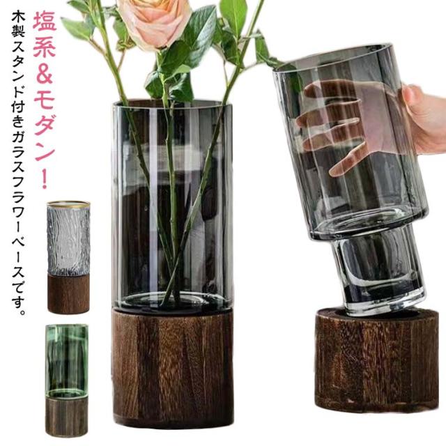 花瓶 おしゃれ ガラス 木製スタンド 付き フラワーベース 北欧 花器 透明 花びん シンプル 可愛い かわいい レトロ 円柱 円形 生花 生け花 フラワースタンド