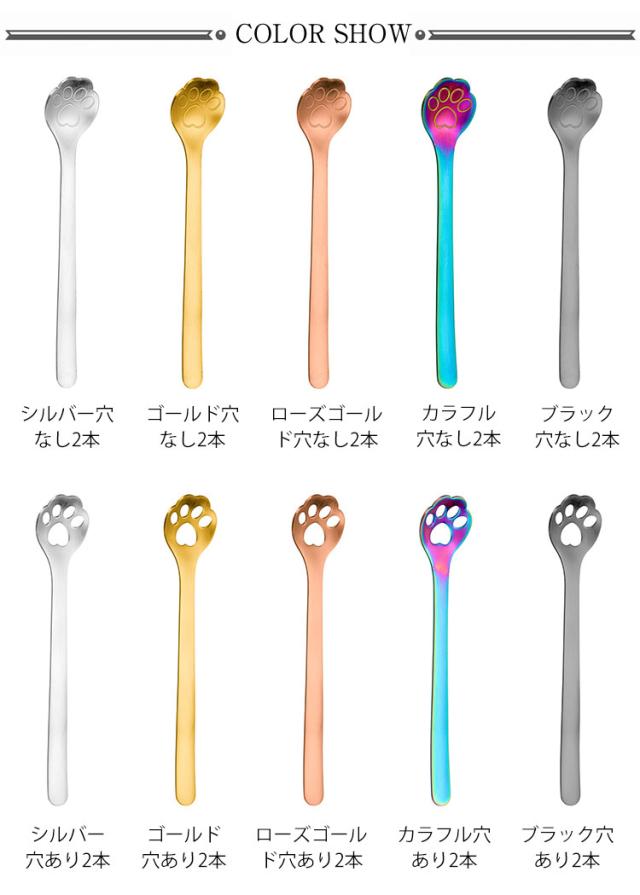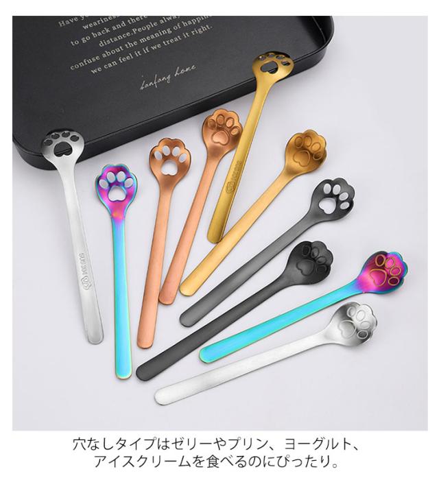 | 可愛い猫の手形のスプーン。 穴ありタイプは、紅茶やコーヒーを飲むときに砂糖やミルクを混ぜ混ぜするときにとても便利なスプーン。 穴なしタイプはゼリーやプリン、ヨーグルト、アイスクリームを食べるのにぴったり。 お客さまのおもてなしに、コーヒースプーンとしても便利で喜ばれます。 毎日のカフェ(ティー)タイムが楽しくなりますね。 | |