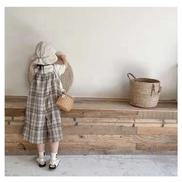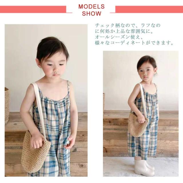 送料無料 チェック サロペット 子供服 キッズ 女の子 オールインワン ルーズ ロンパース キャミ オールインワン 体型カバー シンプル チェック 九分丈 ワイドパンツ ガウチョパンツ 重ね着 レイヤード 春 夏 秋