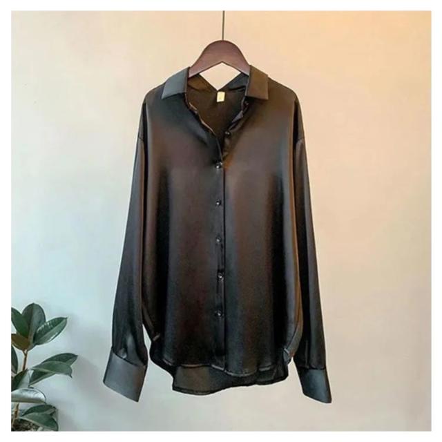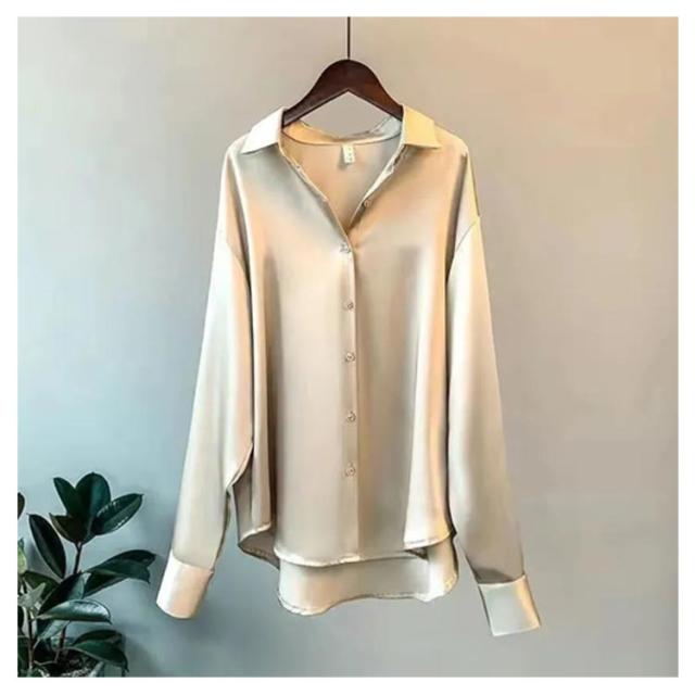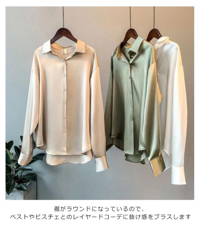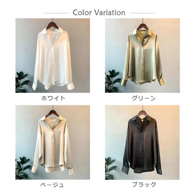 | 抜け感のある大人の着こなしを叶えるシャツブラウス。 上品な光沢のあるサテン生地でフェミニンな印象を与えます。 ヒップが隠れる少し長め丈で、程よい抜け感をプラスしてくれます。 裾がラウンドになっているので、ベストやビスチェとのレイヤードコーデに抜け感をプラスします ゆったりとしたデザインが、体のラインを女性らしく美しく魅せてくれます。 パンツスタイルでもスカートスタイルでも合わせやすい汎用性の高さが魅力です。 幅広くコーディネートにお使いいただけるシャツです。 | |