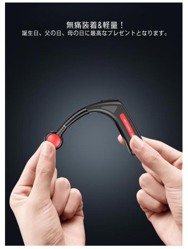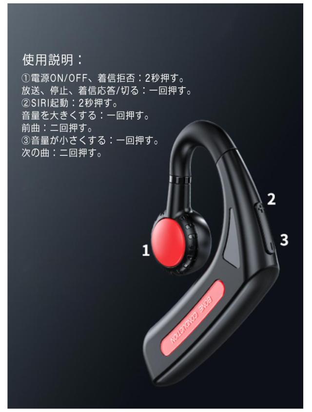 | 耳を塞がずに快適に音楽を楽しめる骨伝導イヤホン! 左右耳兼用!イヤーマスクは180°回転、フックが360°回転でき、お好みの角度を調整できます。左右耳とも心良い装着感をもたらします。 無痛装着軽量!誕生日、父の日、母の日に最高なプレゼントとなります。 使用説明: 電源ON/OFF、着信拒否:2秒押す。 放送、停止、着信応答/切る:一回押す。 SIRI起動:2秒押す。 音量を大きくする:一回押す。 前曲:二回押す。 音量が小さくする:一回押す。 次の曲:二回押す。 | |