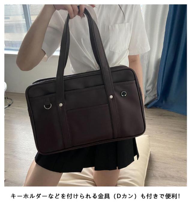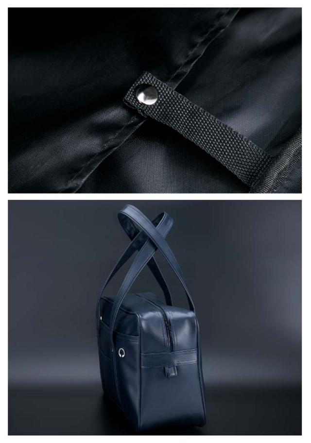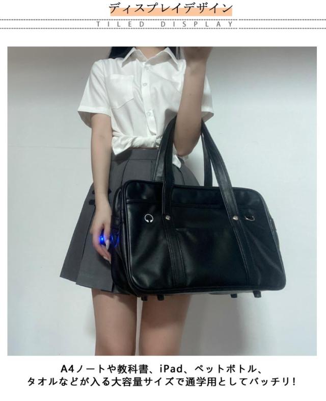 | 大人気のアイテム!ボストンバッグタイプのスクールバッグです。 A4ノートや教科書、iPad、ペットボトル、タオルなどが入る大容量サイズで通学用としてバッチリ! 表面には高品質の合皮を採用し撥水性があるので、多少の雨なら大丈夫。 前面にスマホなどが入る便利な小物ポケット付き。 イヤホン穴付きで気軽に音楽を聴くことができます。 キーホルダーなどを付けられる金具(Dカン)も付きで便利! 底部には4つの鋲が取り付けられており、底部の摩耗や汚れを防ぐことができます。 通学時や放課後の制服コーデはもちろん、 サブバッグとして修学旅行などにもおすすめ◎ | |