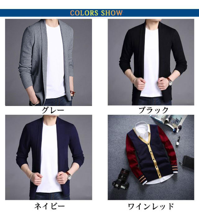 | 洗練されたシンプルなデザインでどんなスタイルとも相性が良くニットカーディガン。 流行に左右されず1枚持っていれば即戦力間違いなしなアイテムです。 程よいタイト感で上品なシルエット。で使いやすいブラック、グレー、ネイビー、ワインレッドの4色展開となっております。 カジュアルなコーディネートにも使いやすく、落ち感のある襟元のデザインでタンクトップやTシャツはもちろん、 Yシャツやハイネック等とのレイヤードもおすすめです。 デニムやチノパンなどにはもちろん、オフィスカジュアルにもお使い頂け、ちょっとした防寒対策やリモート会議などにもおすすめです。 | |
