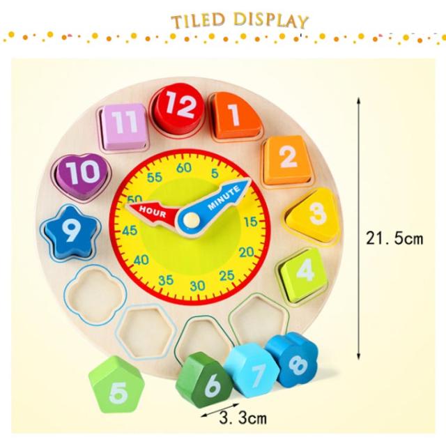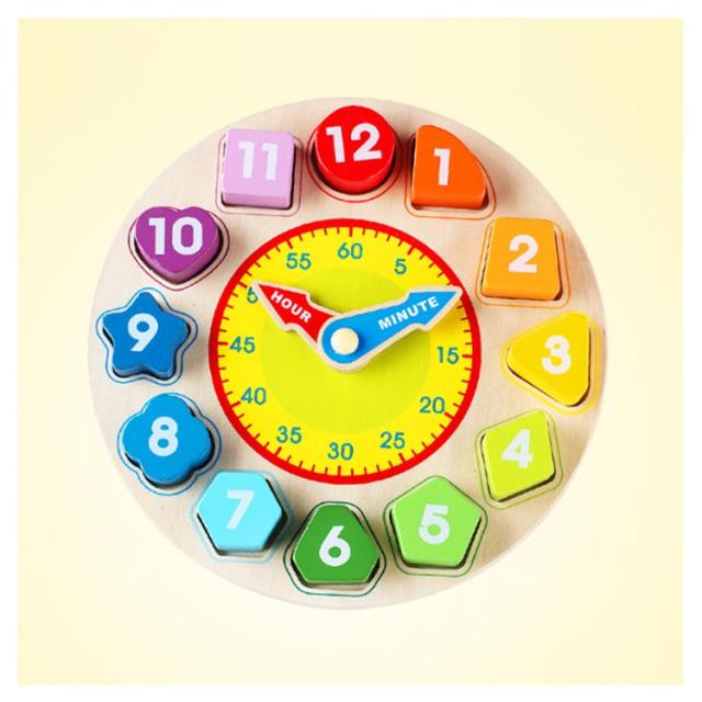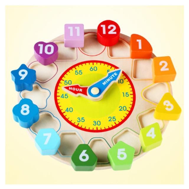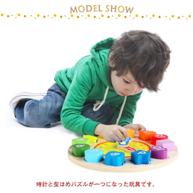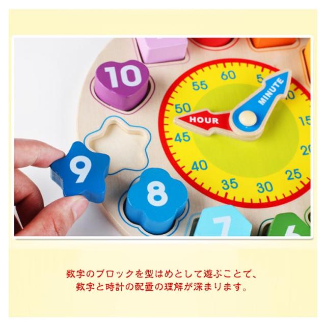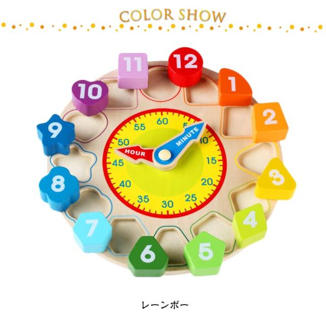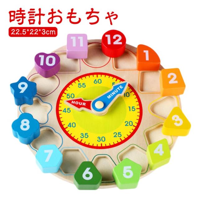 | 時計おもちゃ 時計と型はめパズルが一つになった玩具です。 数字のブロックを型はめとして遊ぷことで、数字と時計の配置の理解が深まります。 | |