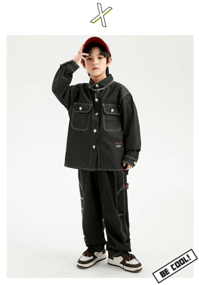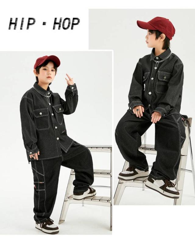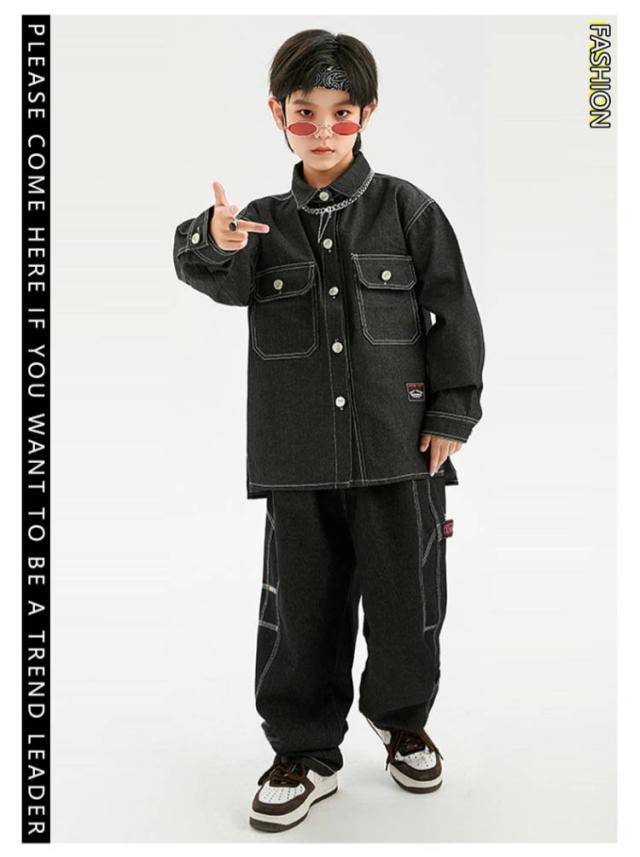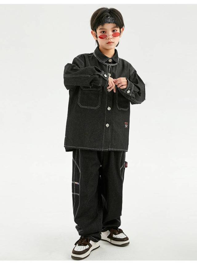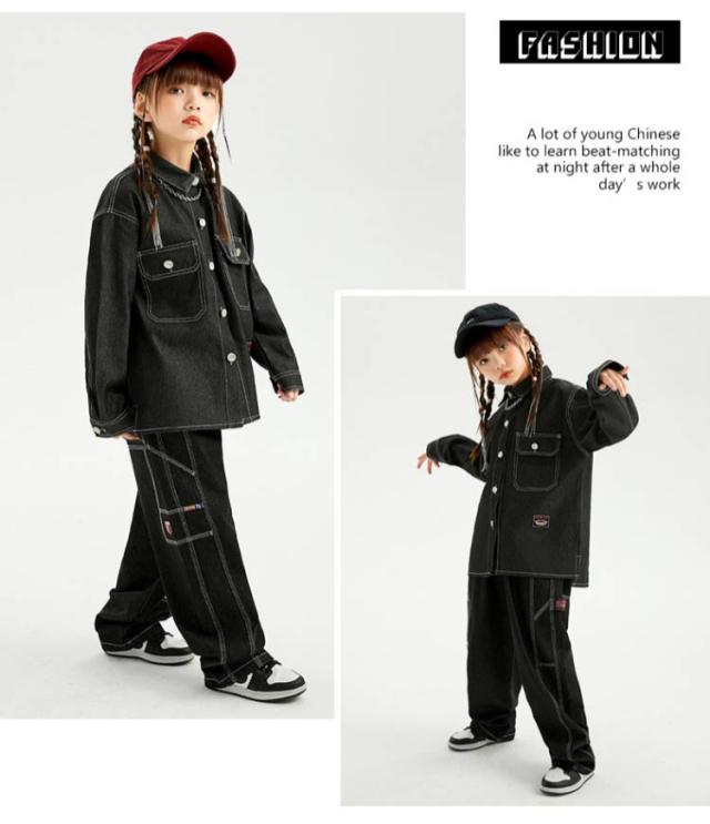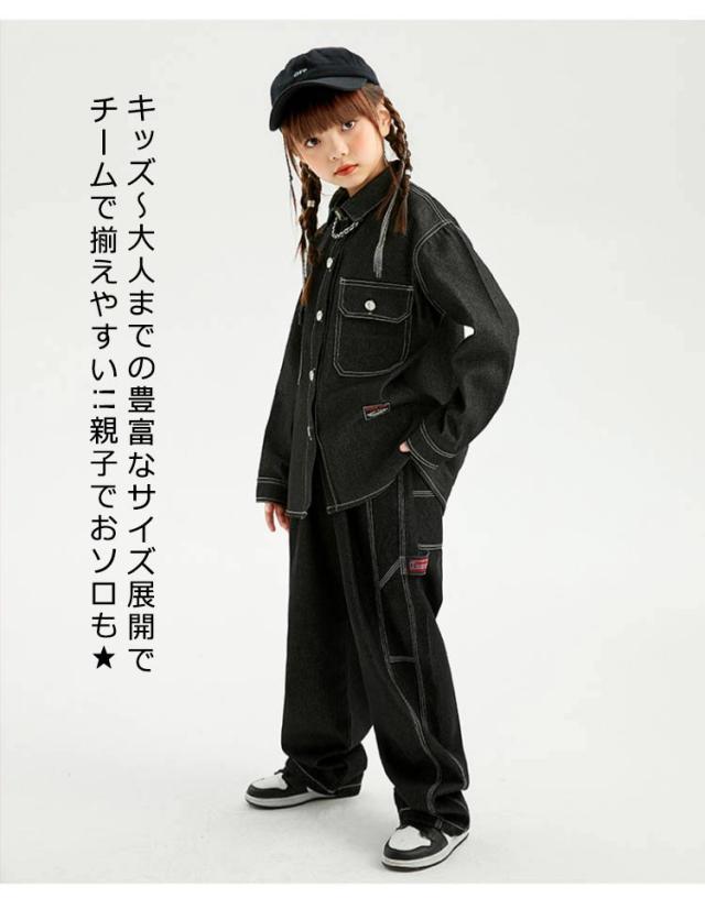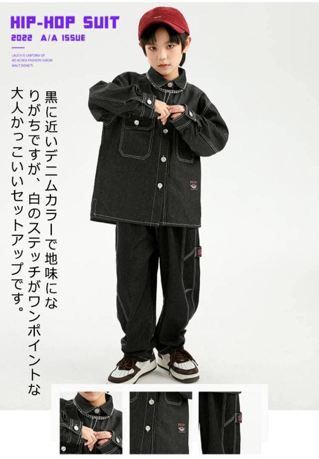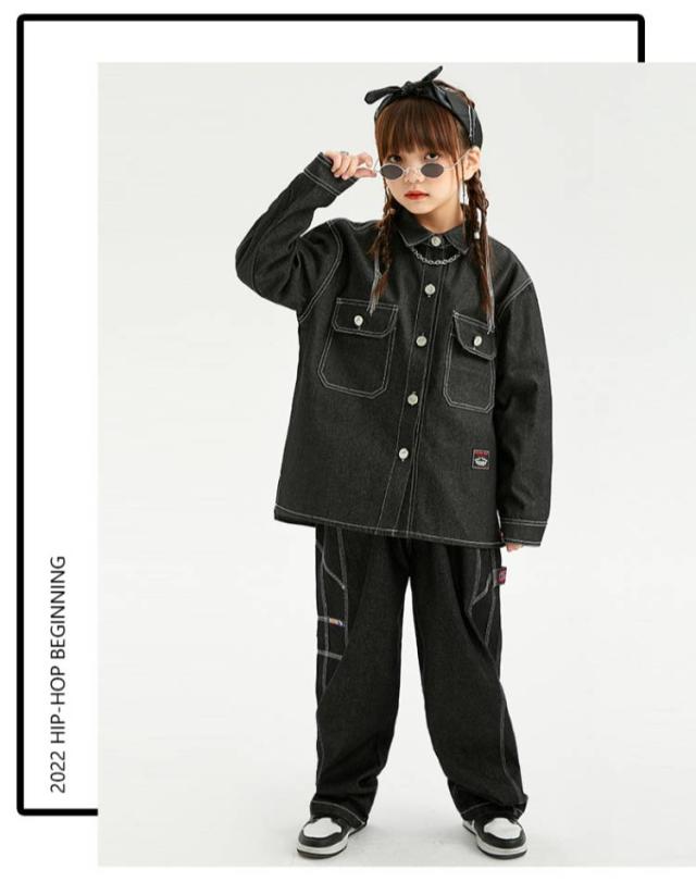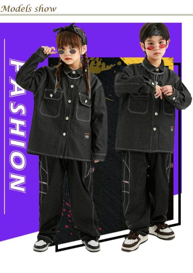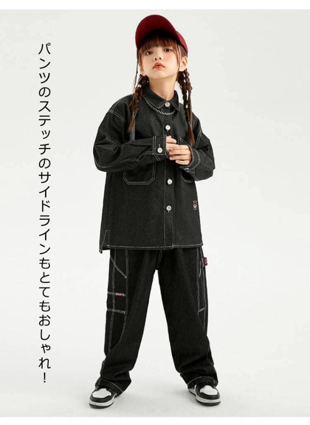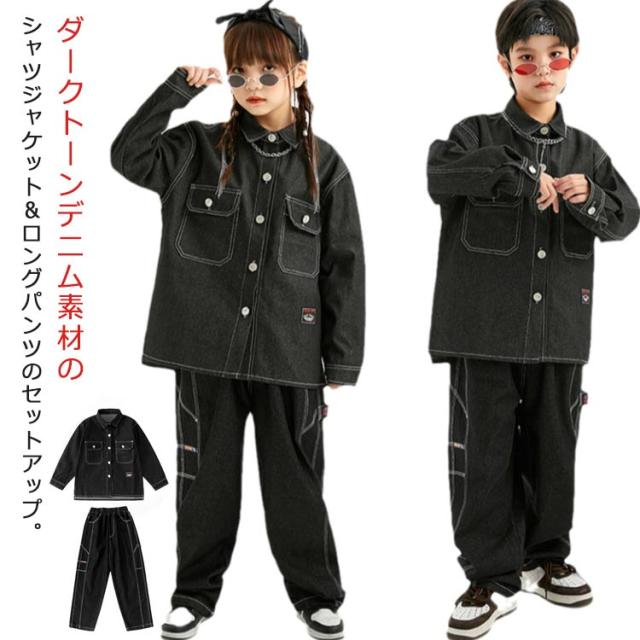 キッズ ダンス 衣装 セットアップ 長袖 デニム シャツ デニムパンツ ジーンズ ジーパン ゆったり ヒップホップ キッズダンス衣装 チーム衣装 練習着 ゆったり ロングパンツ キッズダンス 子供服 hiphop kpop 韓国 ストリート 子供 女の子 男の子