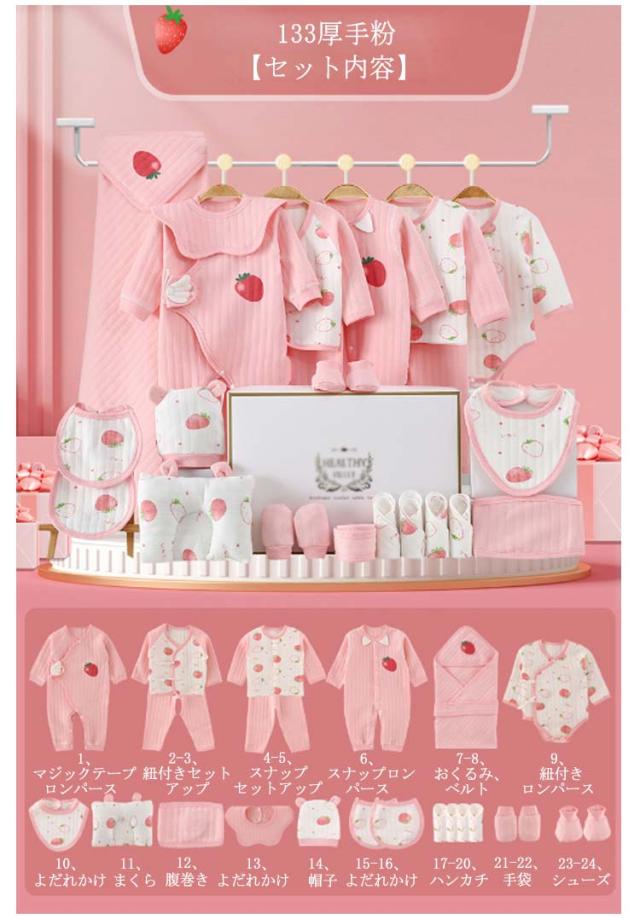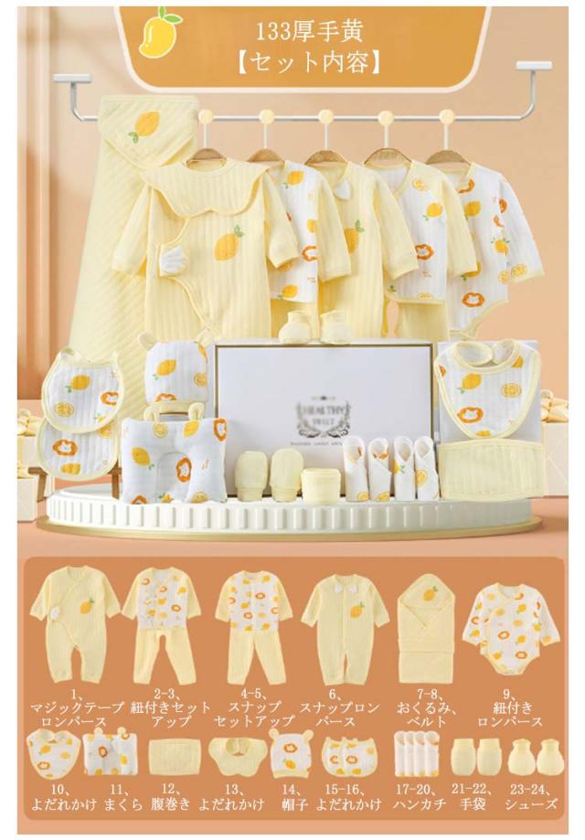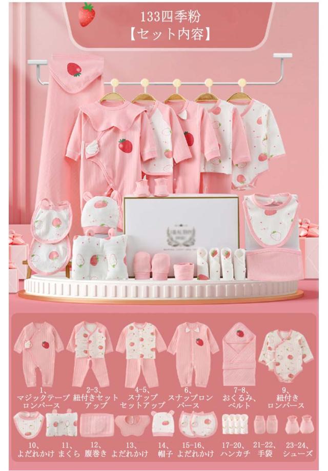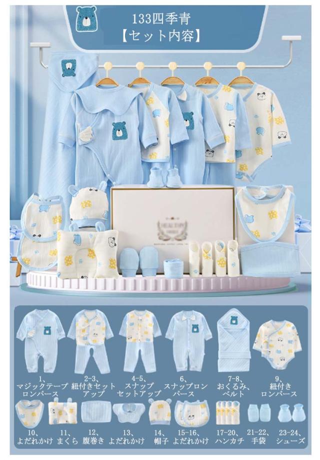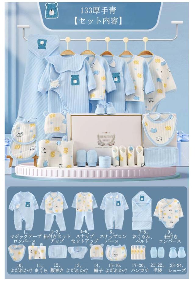| 超かわいいデザイン!出産祝いにも最適24点セットです。 高品質素材上質な素材で作られており、肌触りがやさしくて、赤ちゃんのお肌を守ります。 ご自身の出産準備用はもちろん、誕生日プレゼント、出産祝いや退院祝いなどのお祝い品としても最適です。 | |