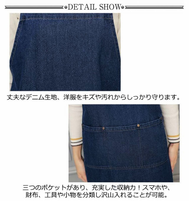 | シンプルなデザインでどんな洋服とも相性抜群のデニムエプロン。 柔らかいデニム素材、着け心地が非常に良く、丈夫で洗濯機で丸洗いOK。 太めの肩紐で肩に優しく、首へのストレスもなく、長時間つけても肩に負担がかからない。 三つのポケットがあり、充実した収納力!スマホや、財布、工具や小物を分類し沢山入れることが可能。 丈夫なデニム生地、洋服をキズや汚れからしっかり守ります。 バック紐結びタイプ、自分のウエストサイズに合わせて着用できます。 | |