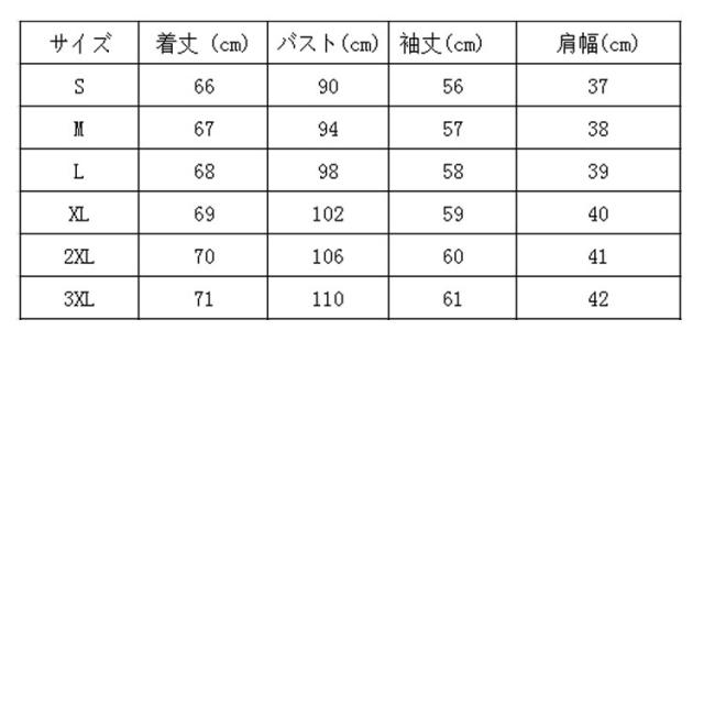 | サイズについての説明 | サイズ バスト(cm) 肩幅(cm) 袖丈(cm) 着丈(cm) ※サイズ表の実寸法は商品によって1-3cm程度の誤差がある場合がございます。 |