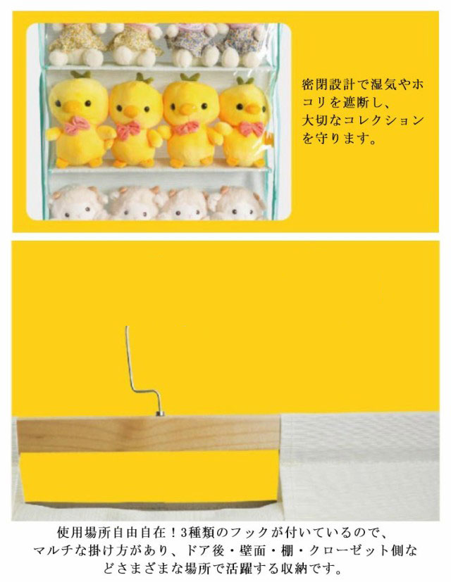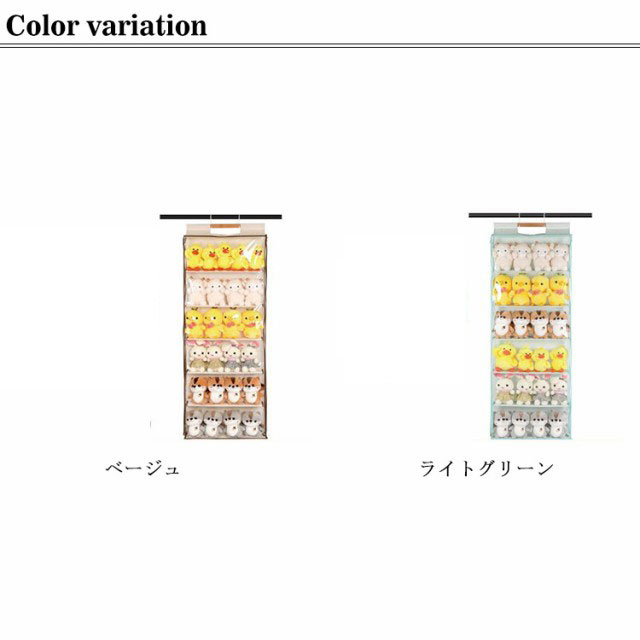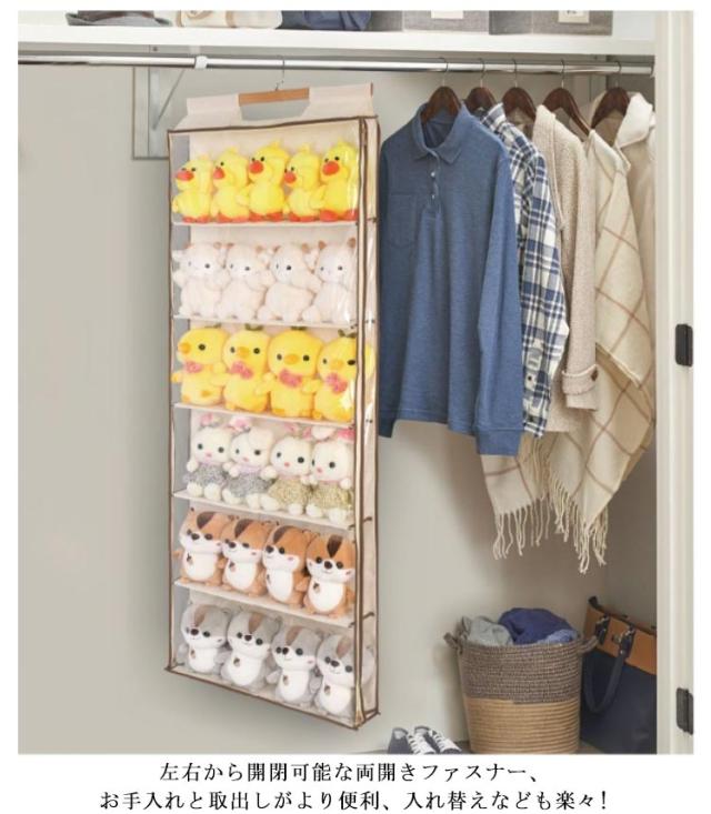 | 6段ぬいぐるみウォールポケット。スタイリッシュデザインのディスプレイラックです。 透明度の高いビニールになっていて、中に入れたものをディスプレイしながら壁面に収納できるアイテム。 左右から開閉可能な両開きファスナー、お手入れと取出しがより便利、入れ替えなども楽々! 密閉設計で湿気やホコリを遮断し、大切なコレクションを守ります。 使用場所自由自在!3種類のフックが付いているので、マルチな掛け方があり、ドア後・壁面・棚・クローゼット側などさまざまな場所で活躍する収納です。 使わない時は、折りたたんでコンパクトに収納でき、保管も邪魔にならない、人気のかばんラックです。 | |
