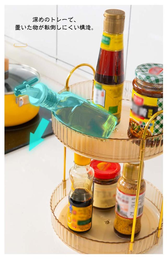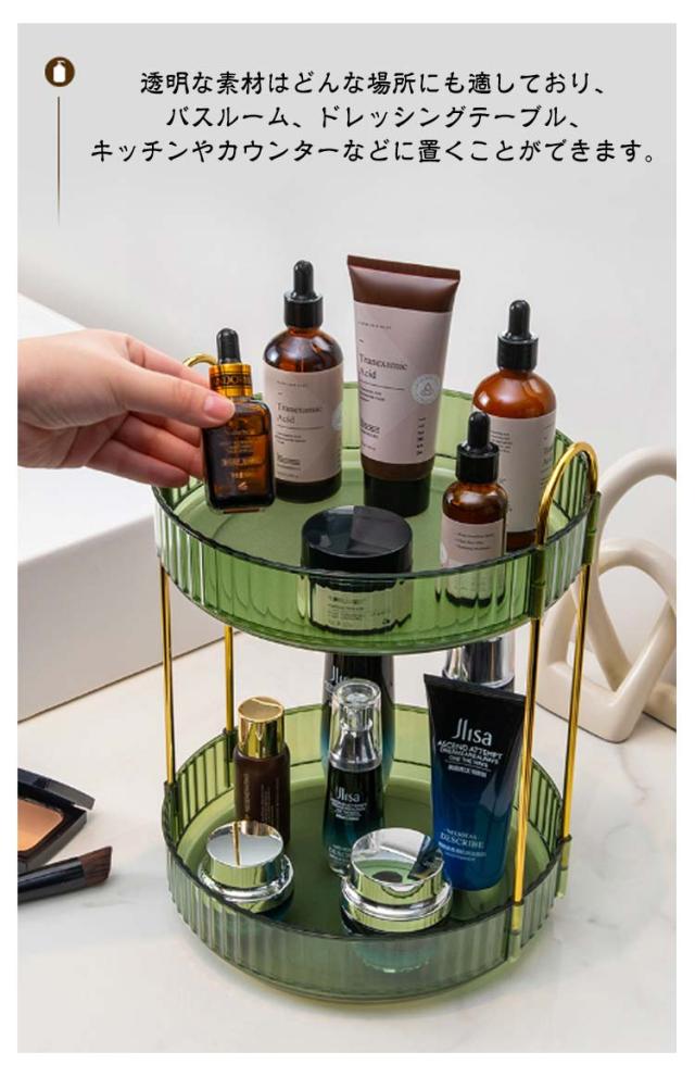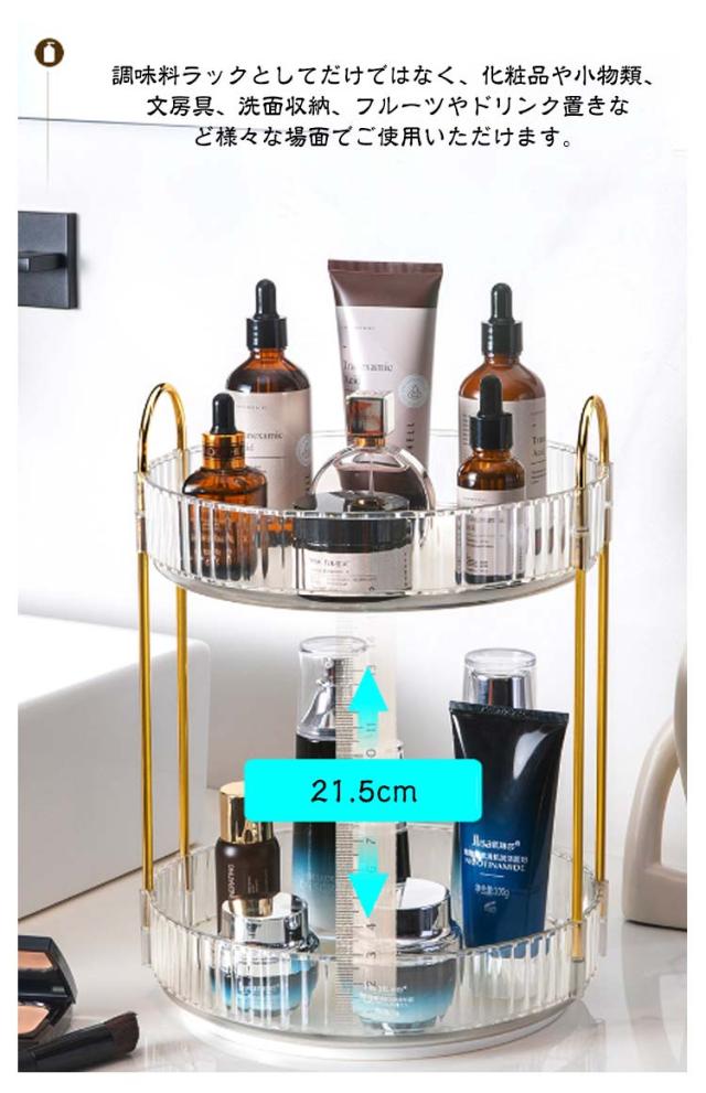 | 360度回転可能。化粧品がどこにあっても、回転させるだけですぐに取り出すことができ、時間を節約できます。 深めのトレーで、置いた物が転倒しにくい構造。 透明な素材はどんな場所にも適しており、バスルーム、ドレッシングテーブル、キッチンやカウンターなどに置くことができます。 調味料ラックとしてだけではなく、化粧品や小物類、文房具、洗面収納、フルーツやドリンク置きなど様々な場面でご使用いただけます。 | |