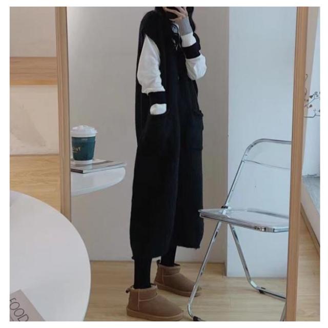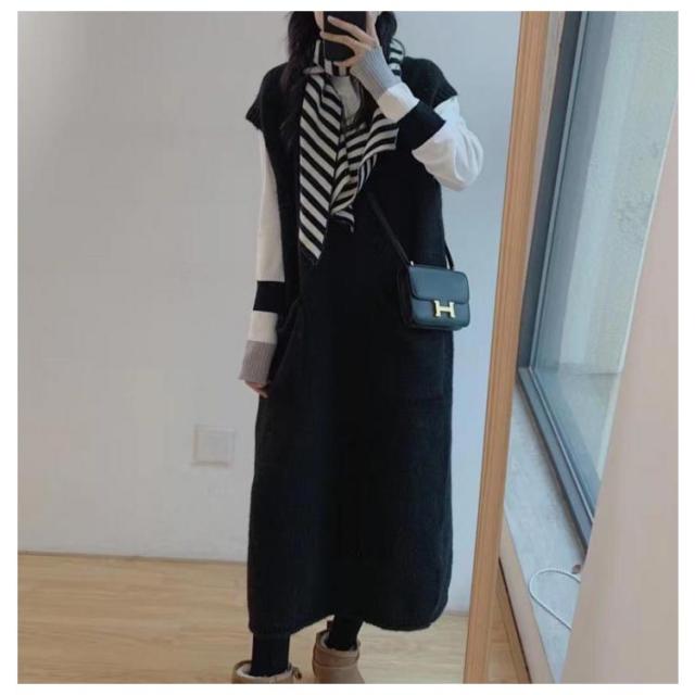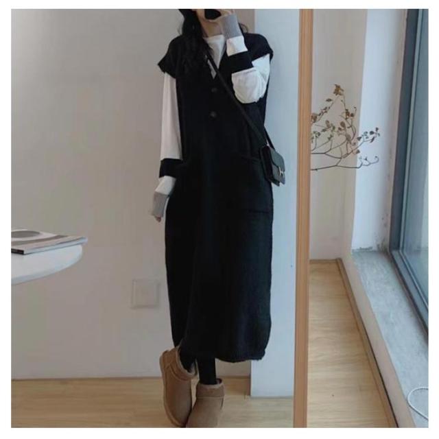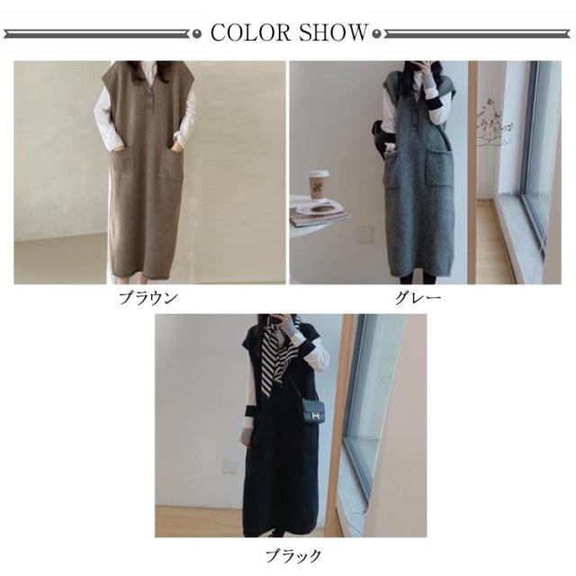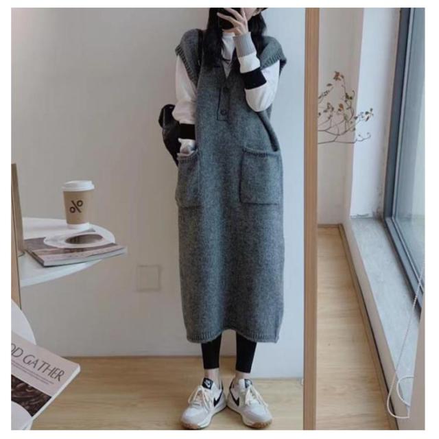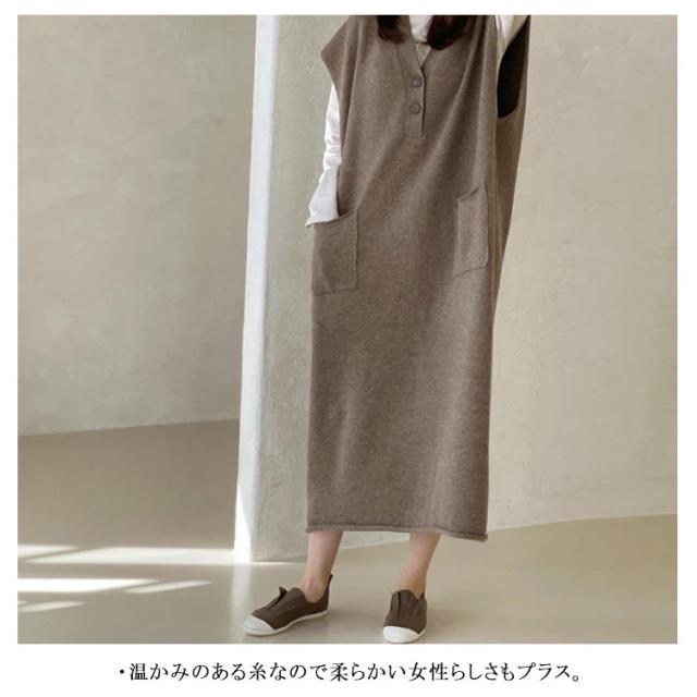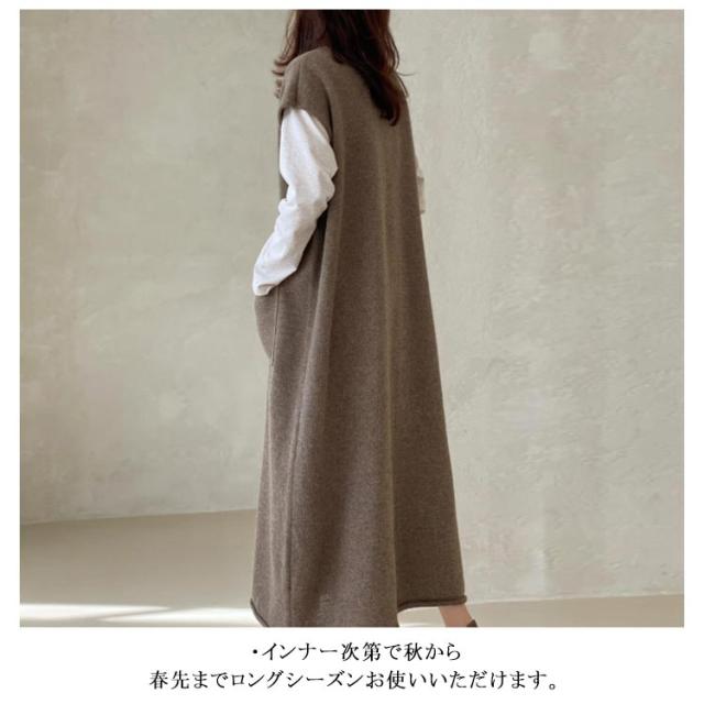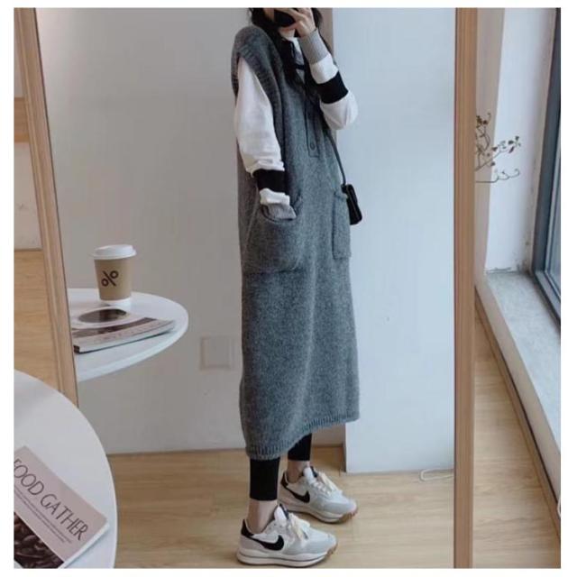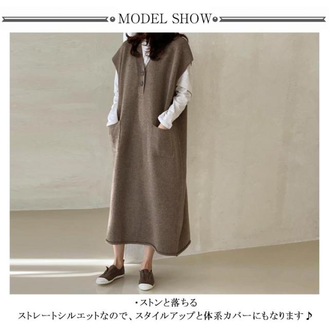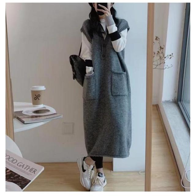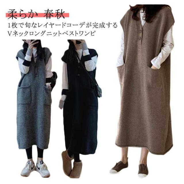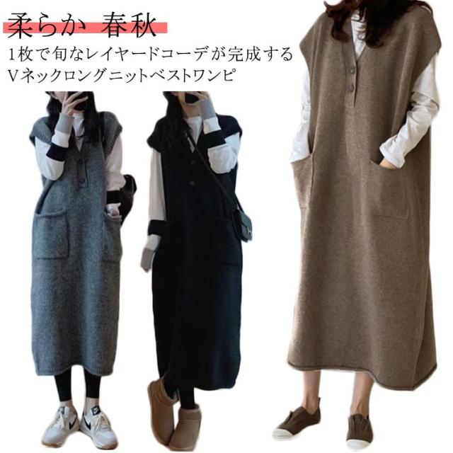 ニットベストワンピース レイヤード ニットワンピース 重ね着 Vネック 体型カバー ロング ポケット付き トップス セーター カジュアル 春 ニットワンピース 秋