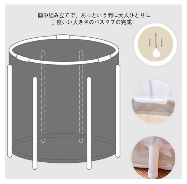 | サッと組み立てていつでも気軽にバスタイム!折りたたみ式のポータブルバスタブです。 優しい耐摩耗性の防水生地、強化綿、PVC材料など使用! 簡単組み立てで、あっという間に大人ひとりに丁度いい大きさのバスタブの完成! 水を抜けばコンパクトになり、軽量で収納場所にも困らず持ち運びも楽々。 おうちのシャワールームや水遊び、災害時、アウトドアにもオススメです | |