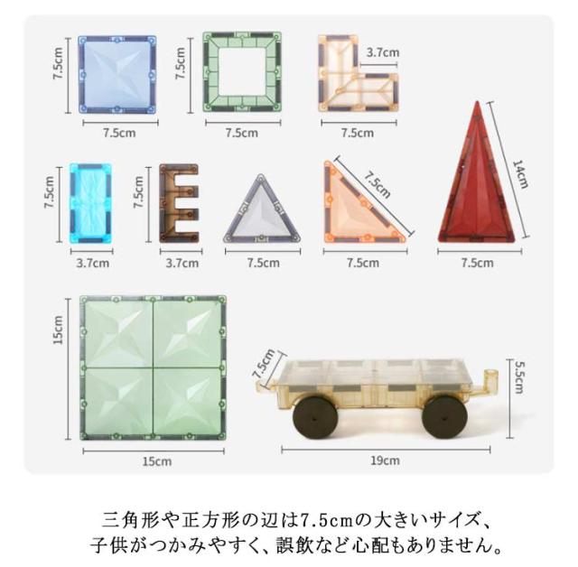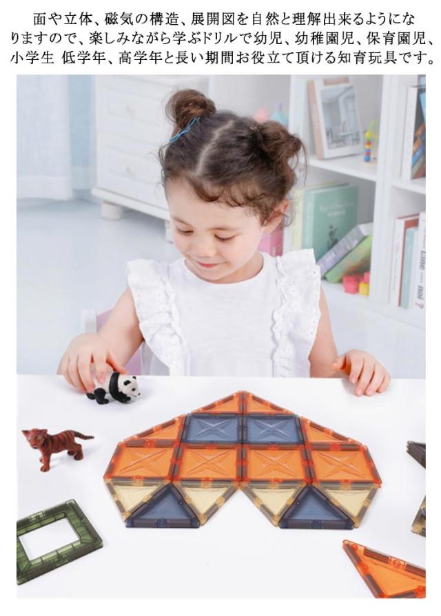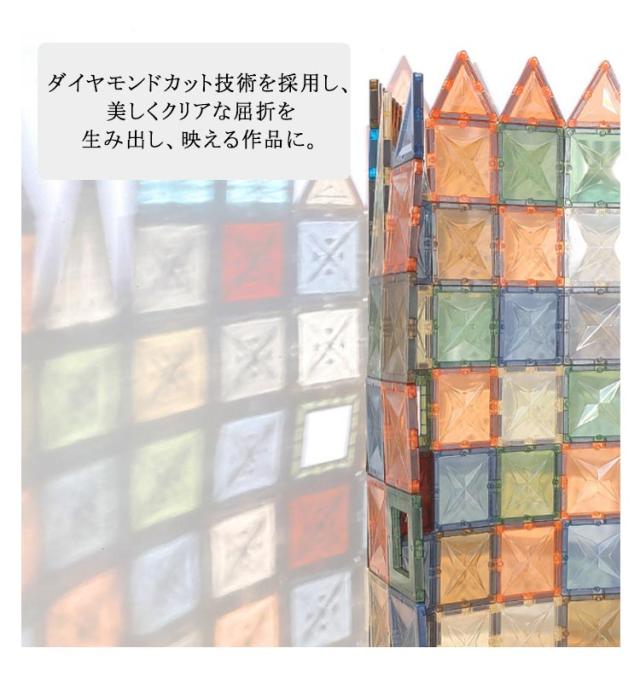 | 光をより美しく反射する4Dダイヤモンドカット マグネットブロック。 面でできた磁石ブロックを磁力でくっつけたり離したり、平面から立体的な3Dまで多彩な創造物を作れる磁石ブロックなので、大人でも十分楽しんでいただけます。親子のコミュニケーションの構築にも役立ちます。 面や立体、磁気の構造、展開図を自然と理解出来るようになりますので、楽しみながら学ぶドリルで幼児、幼稚園児、保育園児、小学生 低学年、高学年と長い期間お役立て頂ける知育玩具です。 しっかりとした磁力を持ちながら、幼児の玩具として、お子様が指を挟んでも痛くならない安全仕様。 三角形や正方形の辺は7.5cmの大きいサイズ、子供がつかみやすく、誤飲など心配もありません。 ダイヤモンドカット技術を採用し、美しくクリアな屈折を生み出し、映える作品に。 収納ポーチ付きで子供が自分でラクラク片付けできます。 お誕生日、入園祝い、入学祝い、クリスマスなどのプレゼント、ギフト、贈り物に最適です。 | |