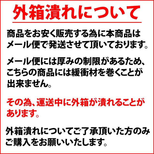 本商品は商品形状の関係で、商品箱自体が一部潰れた状態での発送になる場合があります。こちらは不良品では無く中身自体には影響がないため、予めご了承ください。