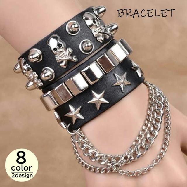 ブレスレット 腕輪 男女兼用 ユニセックス メンズ 男性 レディース 女性 アクセサリー レザー調 幅広 ドクロ 星 チェーン