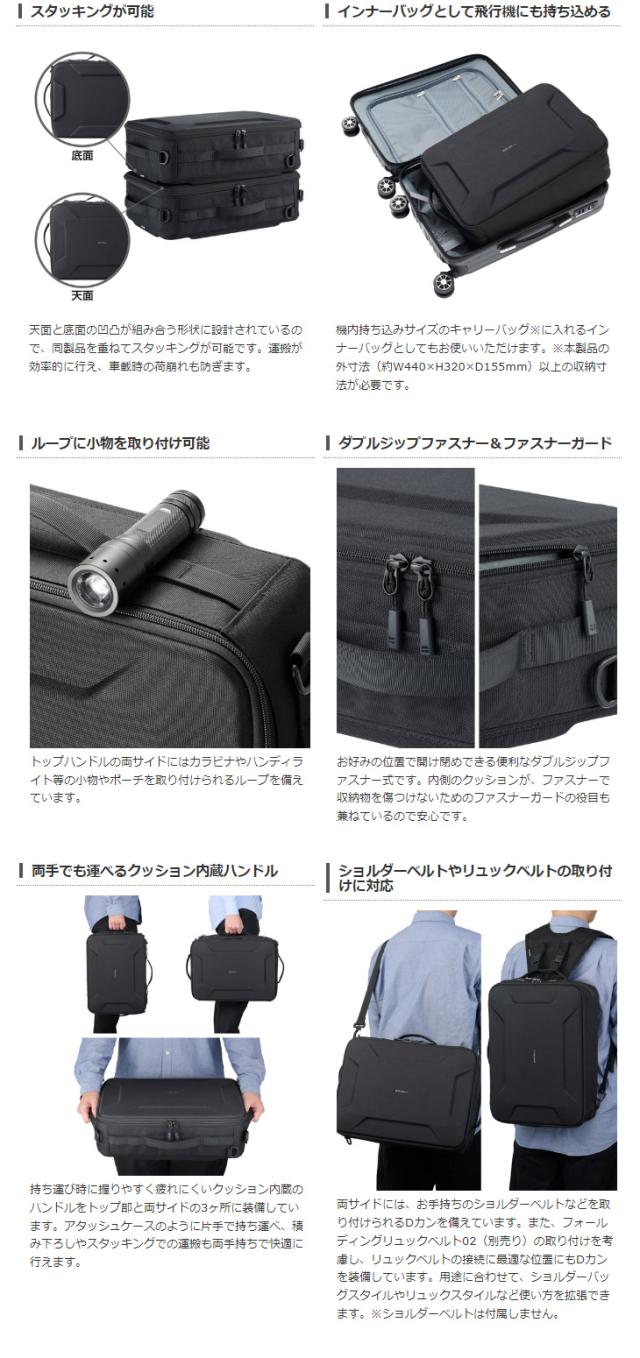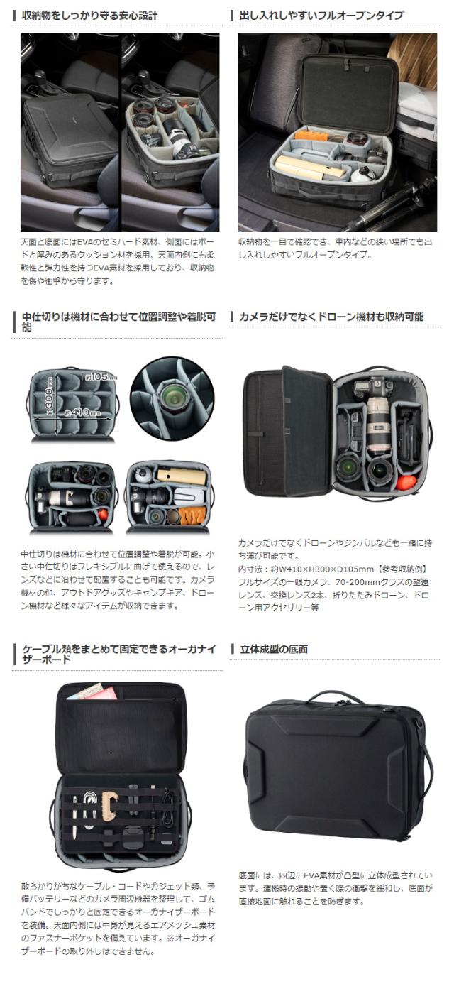 内寸法:約W410×H300×D105mm【参考収納例】フルサイズの一眼カメラ、70-200mmクラスの望遠レンズ、交換レンズ2本、折りたたみドローン、ドローン用アクセサリー等