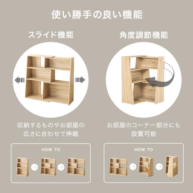 | 説明 | お部屋や収納するものによって幅を変えられる伸縮オープンラック。下の段ほど奥行きが広く使いやすいスタイリッシュなフォルム。 |