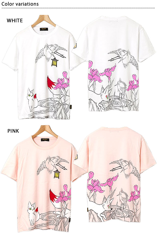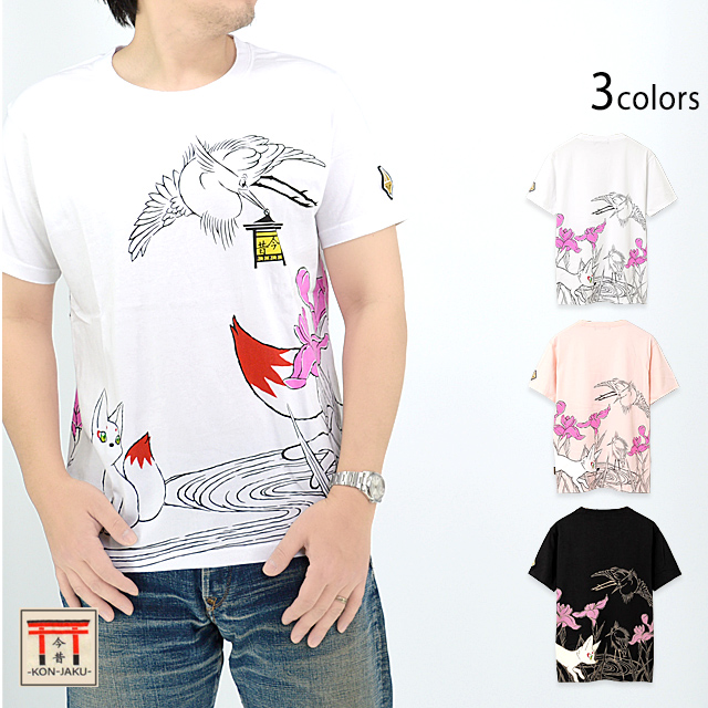 「ことこと(古都古都)物語 川辺に咲く菖蒲と鷺の図」半袖Tシャツ 今昔 KJ-27004 和柄 和風 狐 きつね キツネ
