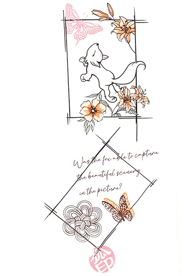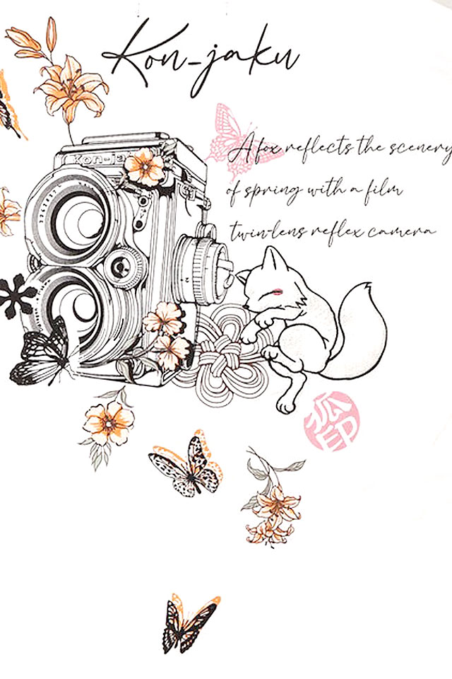 背中の英文は、和訳すると「フィルム二眼レフカメラで春の景色を映すキツネ」という意味。
