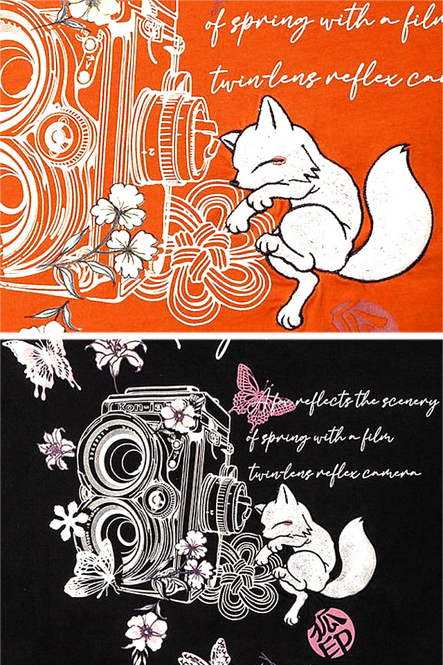 愛らしい狐のキャラクターが主役の【今昔】から「クラシカルな二眼レフカメラ」半袖Tシャツ(KJ-29183)のご紹介です。 今回はクラシカルな二眼レフのカメラと散りばめた花、蝶をモチーフにしています。 背中の英文は、和訳すると「フィルム二眼レフカメラで春の景色を映すキツネ」という意味。 フロントの英文は「キツネは美しい景色を写真に収めることができたでしょうか?」というメッセージになっています。 また、フロントのデザインは写真をイメージしております。 刺繍とプリントで表現された、今昔らしい繊細なデザインの逸品です。 ボディーには軽い着心地の綿生地を採用。 | |||||||||||||||||||||||||