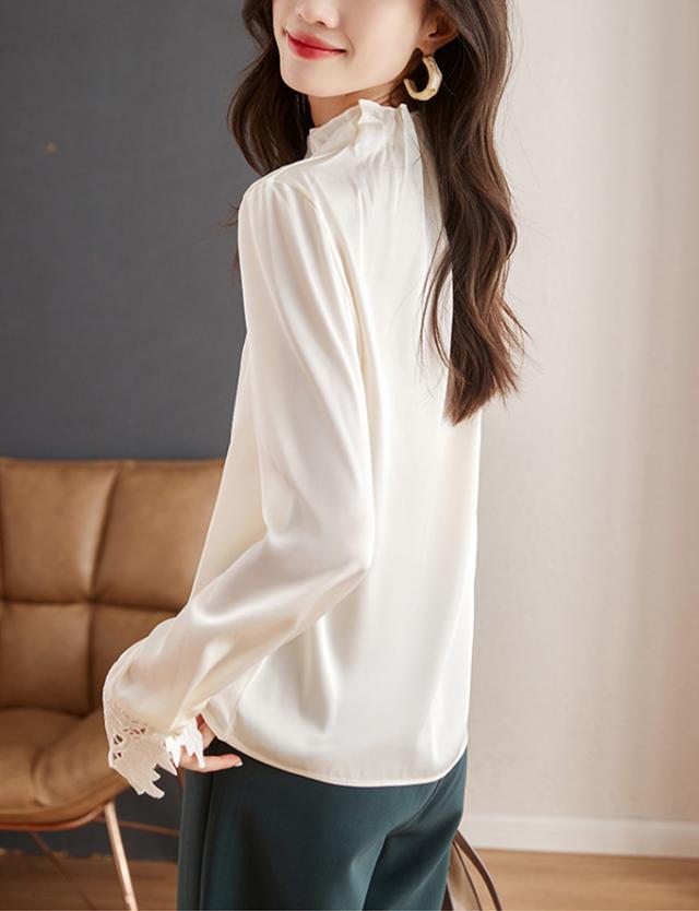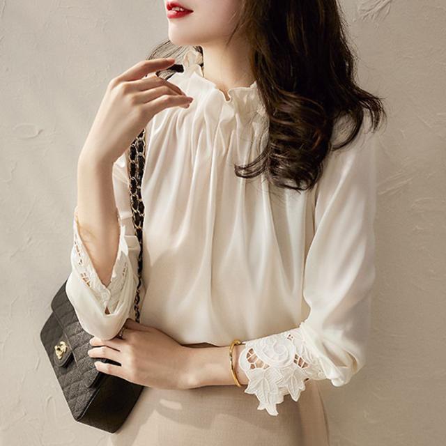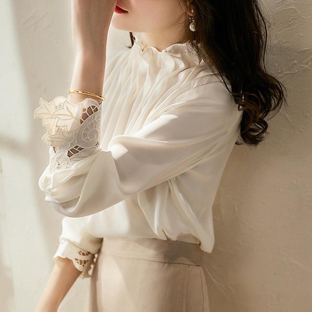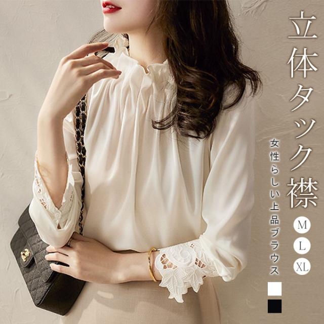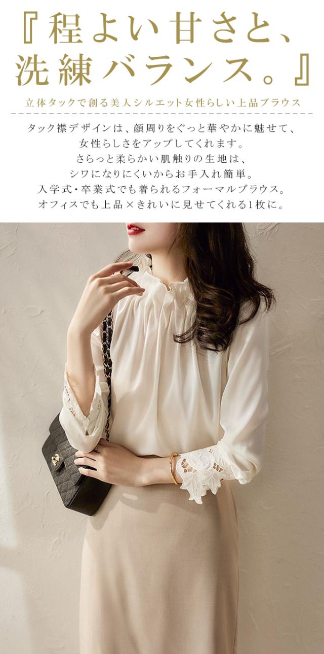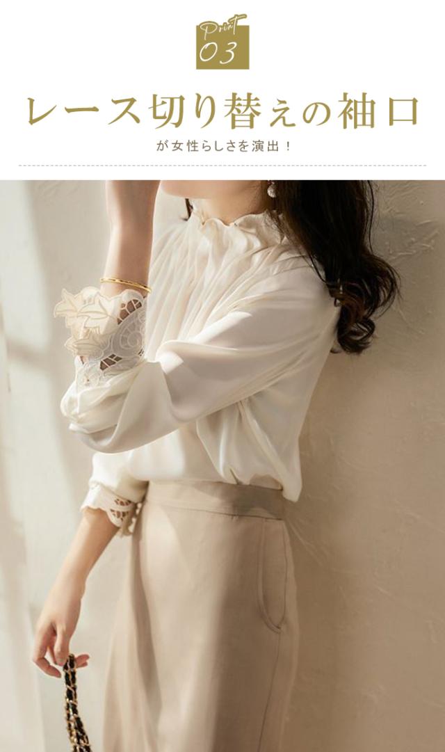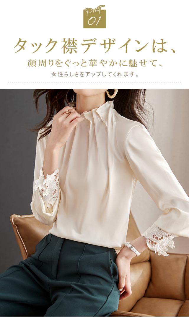 春新作 フリル襟 ブラウス レディース シャツ トップス 長袖 ハイネック レース袖 光沢感 フォーマル タック ギャザー キレイめ オフィス 春 夏 秋 大人可愛い